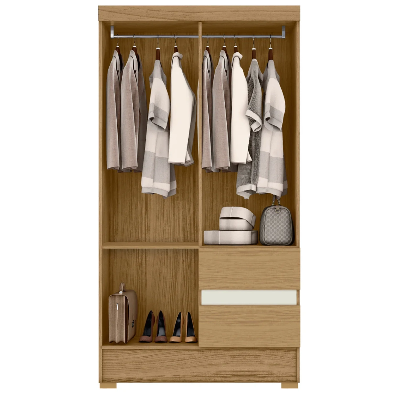 O Roupeiro Solteiro vem com prateleira interna, duas gavetas com corrediças metálicas e um cabideiro em madeira revestida, dá aquele reforço extra na hora de organizar suas roupas.