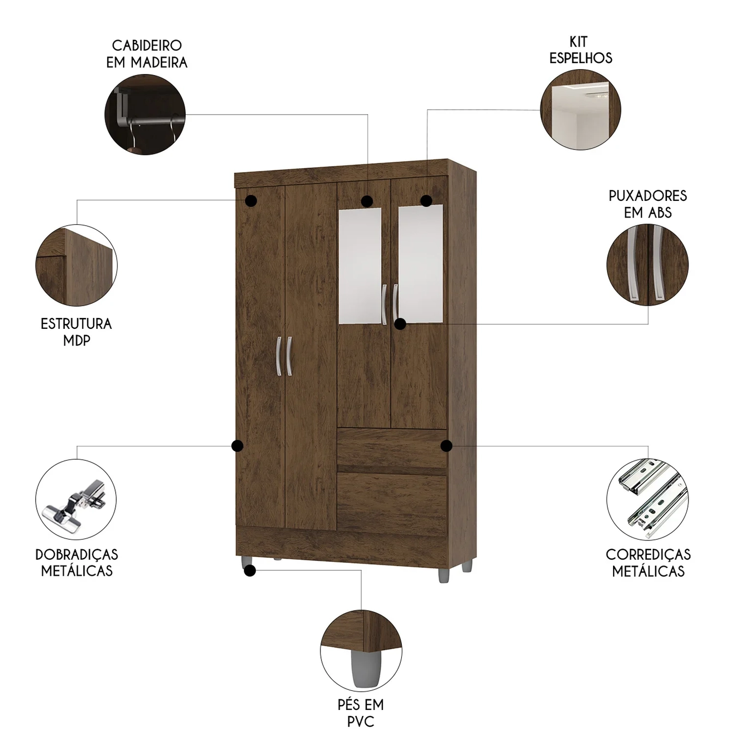 O Guarda Roupa Ideal é a solução compacta e funcional para quem busca otimizar o espaço sem abrir mão da organização. Com quatro portas, sendo duas Portas Com Espelho, e duas gavetas, ele oferece amplo espaço interno para organizar roupas, sapatos e outros pertences de maneira eficiente. Suas cincos prateleiras são perfeitas para manter tudo organizado, enquanto o espaço para cabides facilita o acesso rápido às suas peças favoritas.