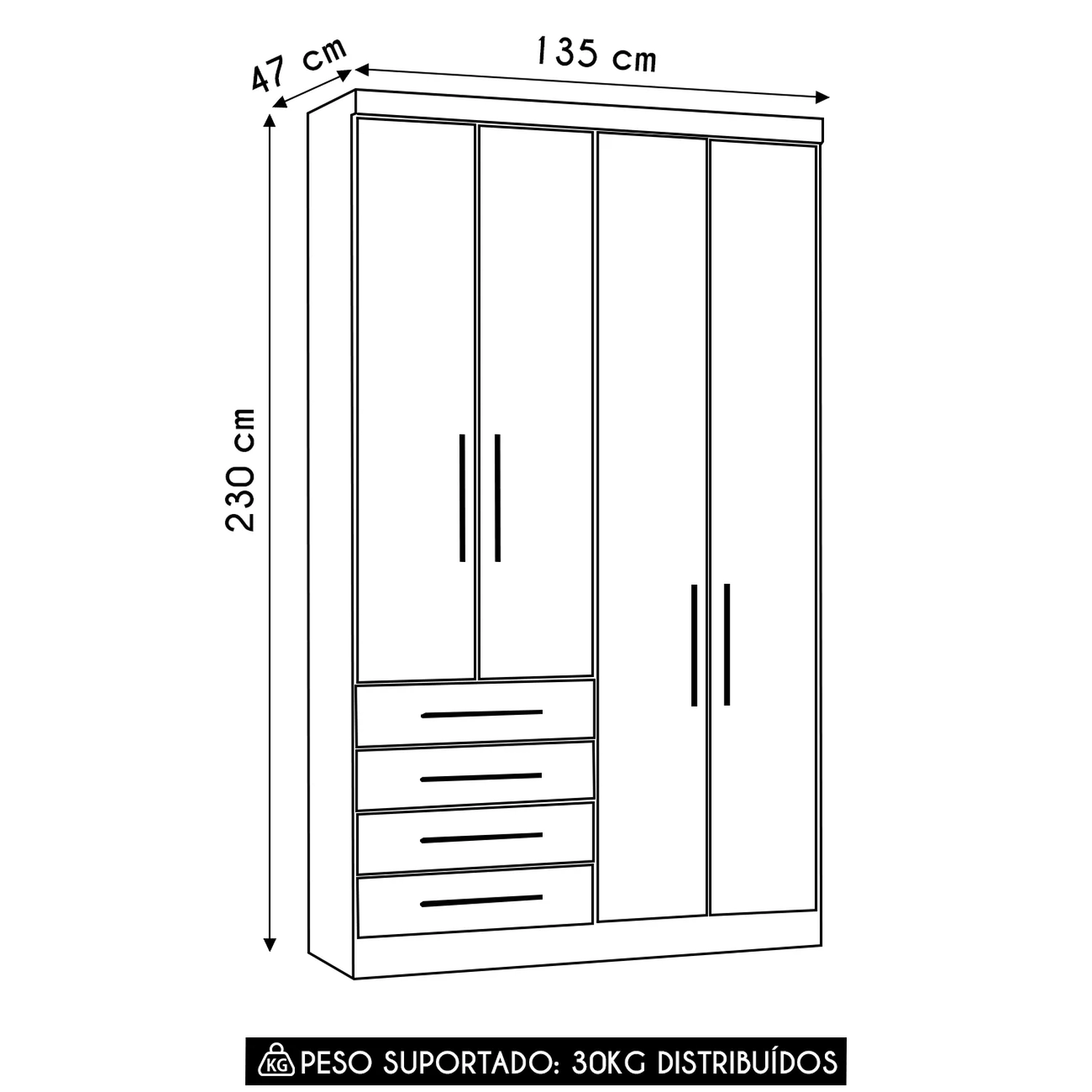 Possui quatro portas com dobradiças metálicas e puxadores em polímero, além de quatro gavetas externas com corrediças telescópicas e puxadores do mesmo material, garantindo praticidade e facilidade no uso diário.