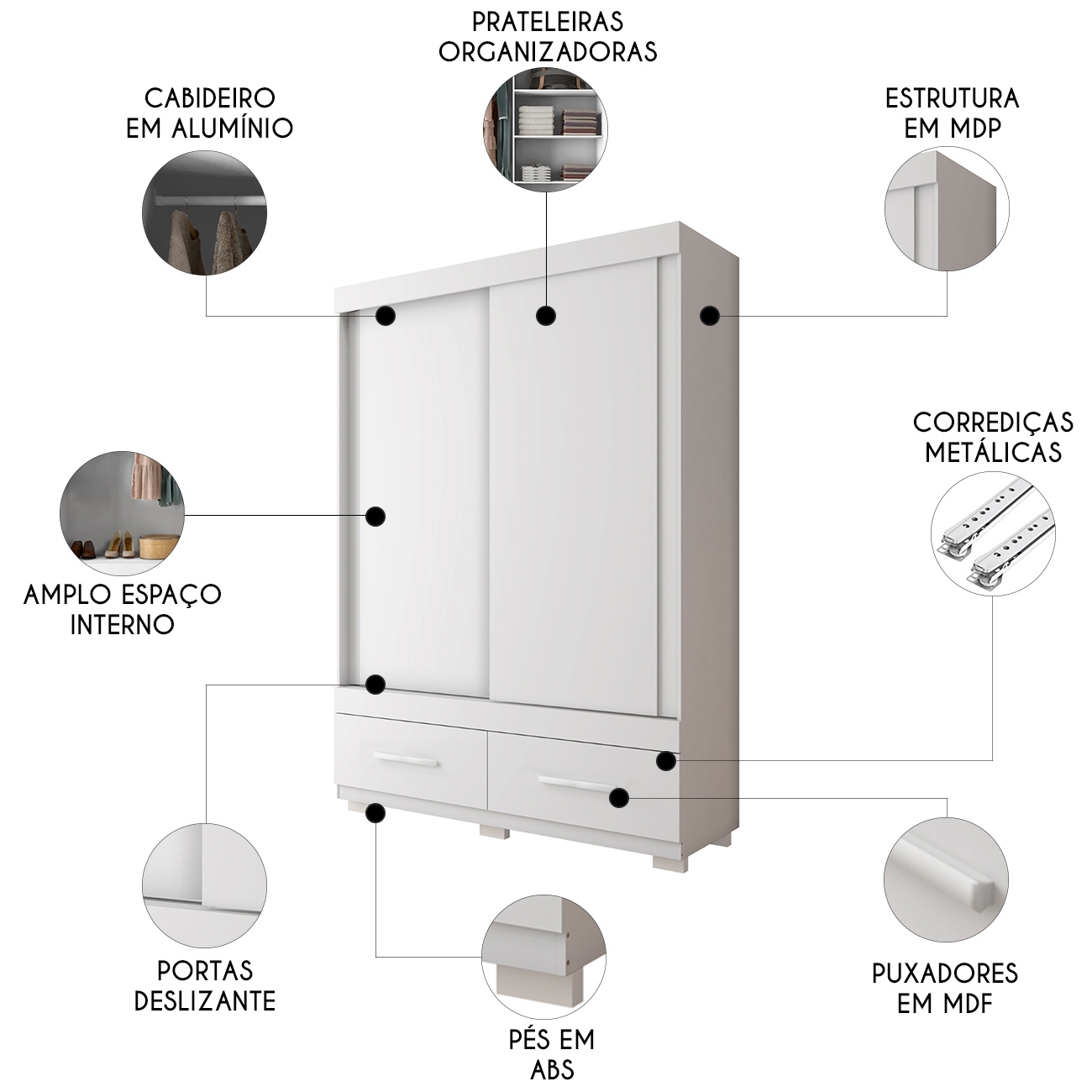 Na parte externa, conta com duas gavetas espaçosas, ideais pra guardar o que você mais usa, já internamente possui quatro prateleiras bem distribuídas e cabideiro pra manter tudo organizado.