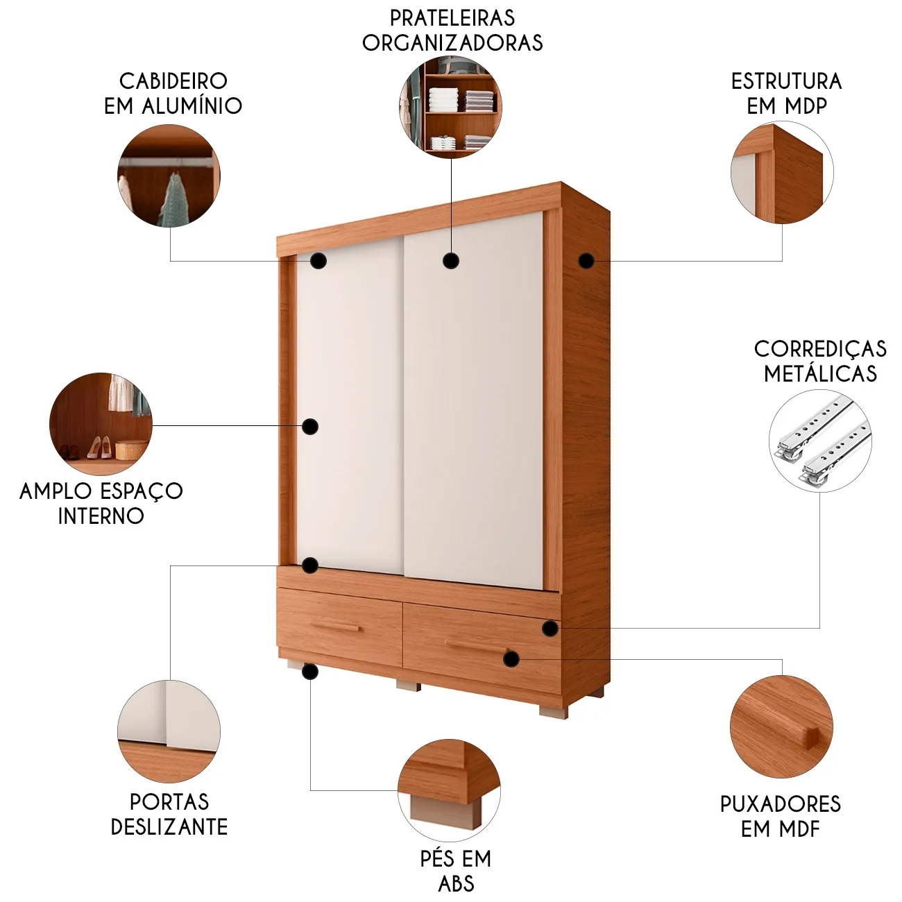 Na parte externa, conta com duas gavetas espaçosas, ideais pra guardar o que você mais usa, já internamente possui quatro prateleiras bem distribuídas e cabideiro pra manter tudo organizado.