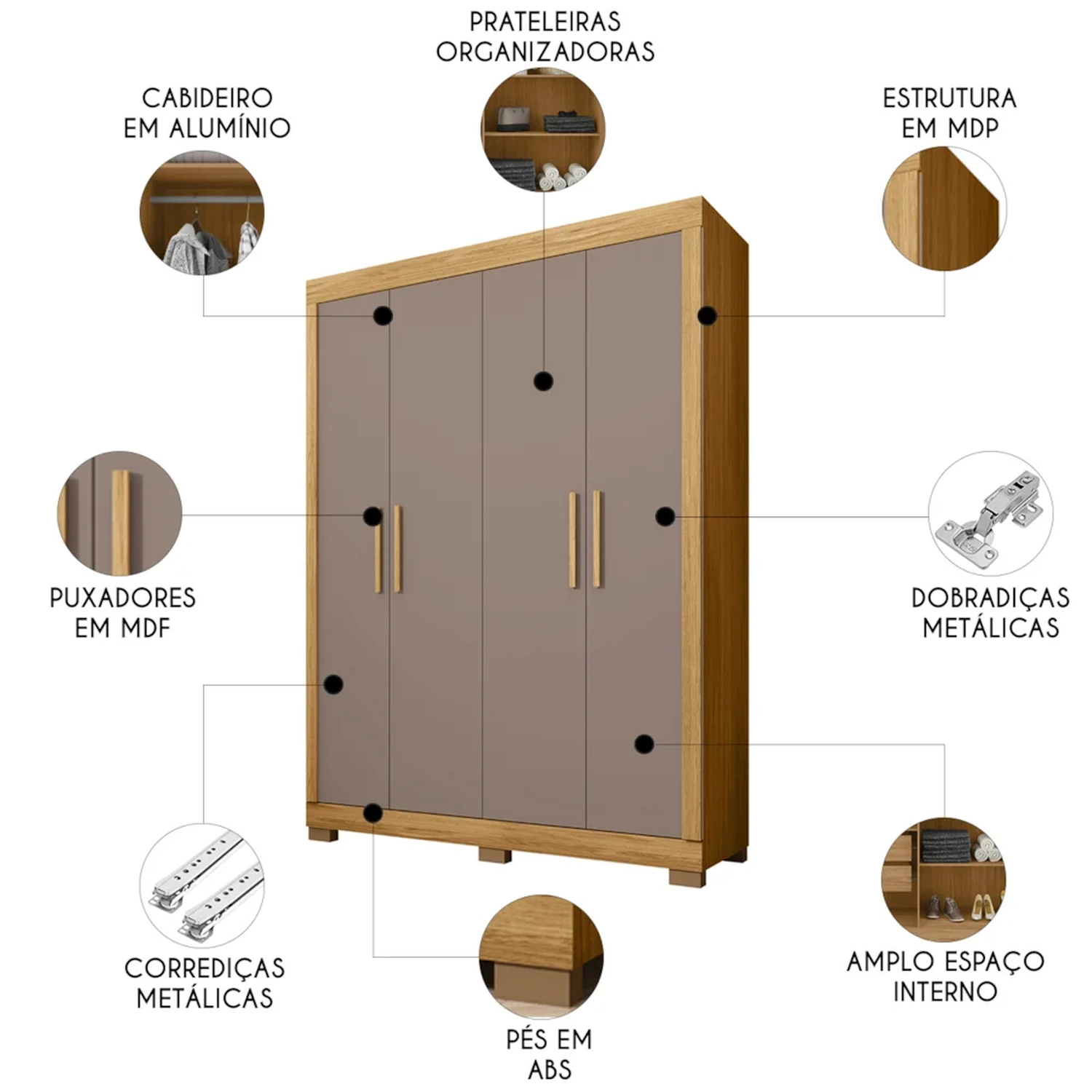 Guarda Roupa Solteiro 154cm com 4 Portas Brasid Mel/Cacao C01 - Mpozenato