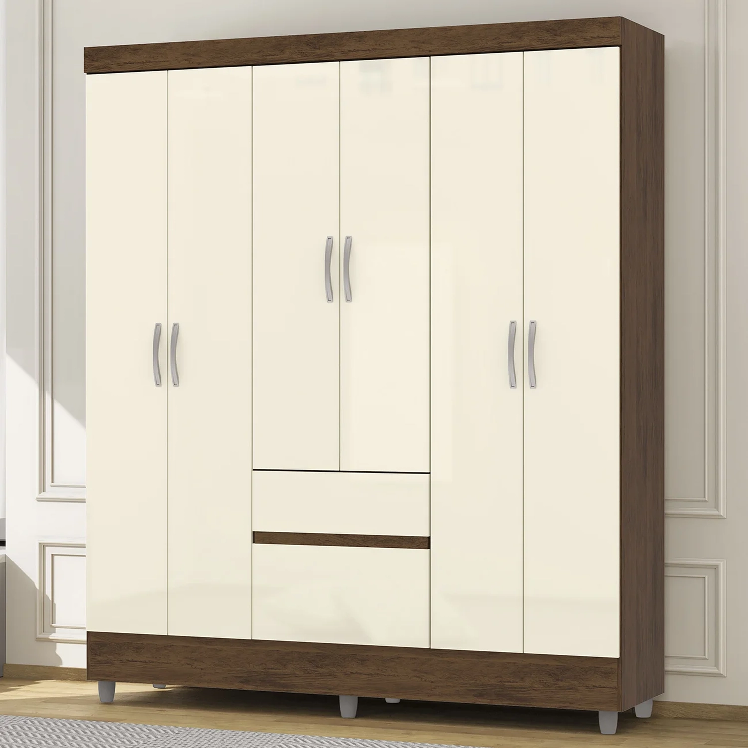 Os pés elevados do guarda roupa protegem o móvel da umidade, aumentando sua vida útil e garantindo uma melhor circulação de ar. Além disso, o design do guarda roupa é pensado para valorizar o ambiente e trazer uma sensação de aconchego e sofisticação ao seu quarto.