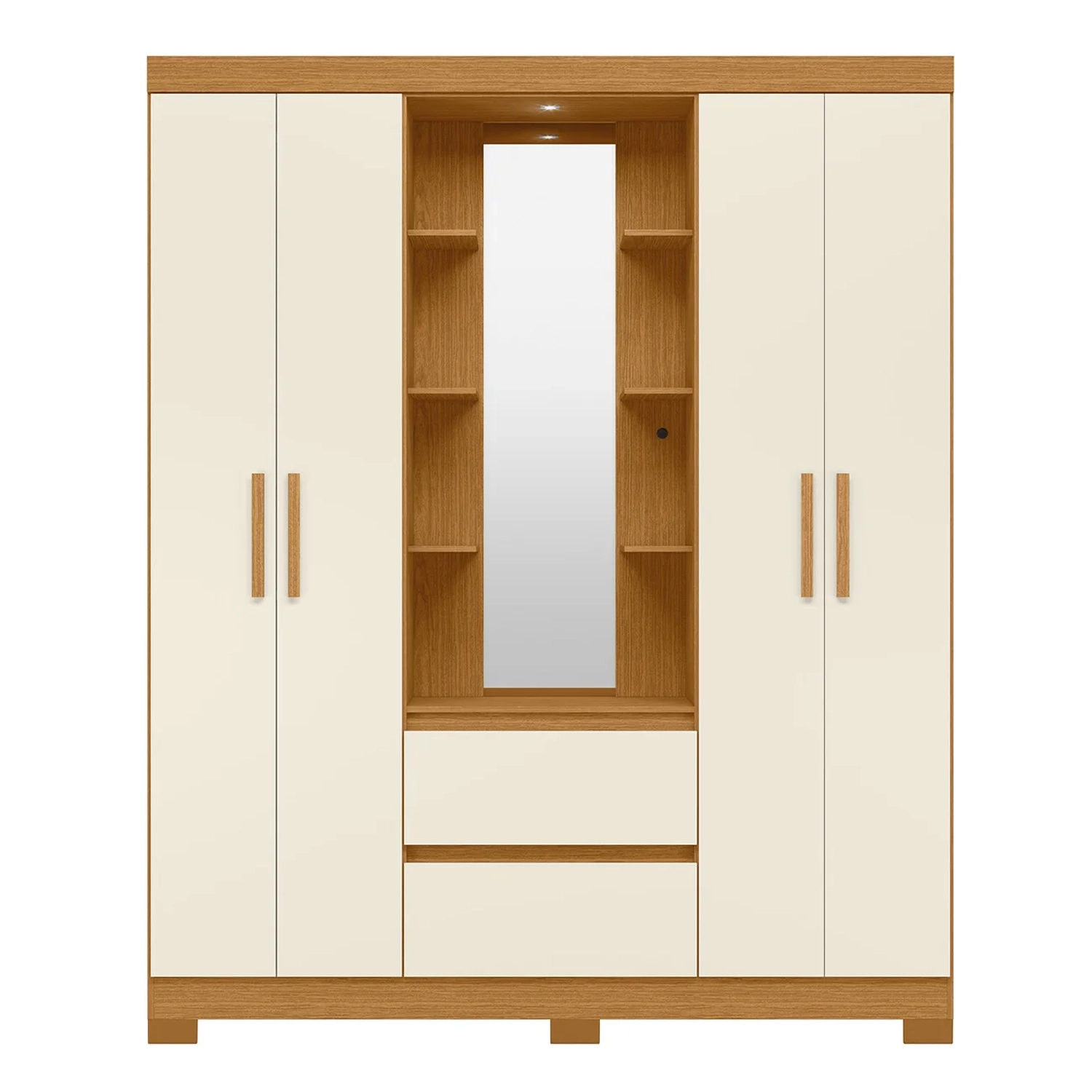 Com um camarim central, equipado com espelho e uma luminária de LED, oferece um ambiente perfeito para você se arrumar e se maquiar com facilidade e conforto. O Guarda Roupa conta com duas gavetas, que possuem corrediças telescópicas para um deslizamento suave e durável, oferecendo um ótimo espaço para armazenar roupas menores e acessórios de forma organizada. Os puxadores de MDF revestidos adicionam um toque refinado e moderno ao móvel, enquanto os dois cabideiros em alumínio garantem o suporte ideal para pendurar suas roupas de forma prática e eficiente. A estrutura do móvel também é reforçada com quatro portas de dobradiças metálicas, que oferecem resistência e durabilidade. Com uma combinação de compartimentos, gavetas e cabideiros, ele proporciona um ambiente organizado e otimizado. Seu design moderno e os acabamentos de alta qualidade tornam este móvel uma excelente escolha para quem busca aliar estilo e funcionalidade em seu Quarto.