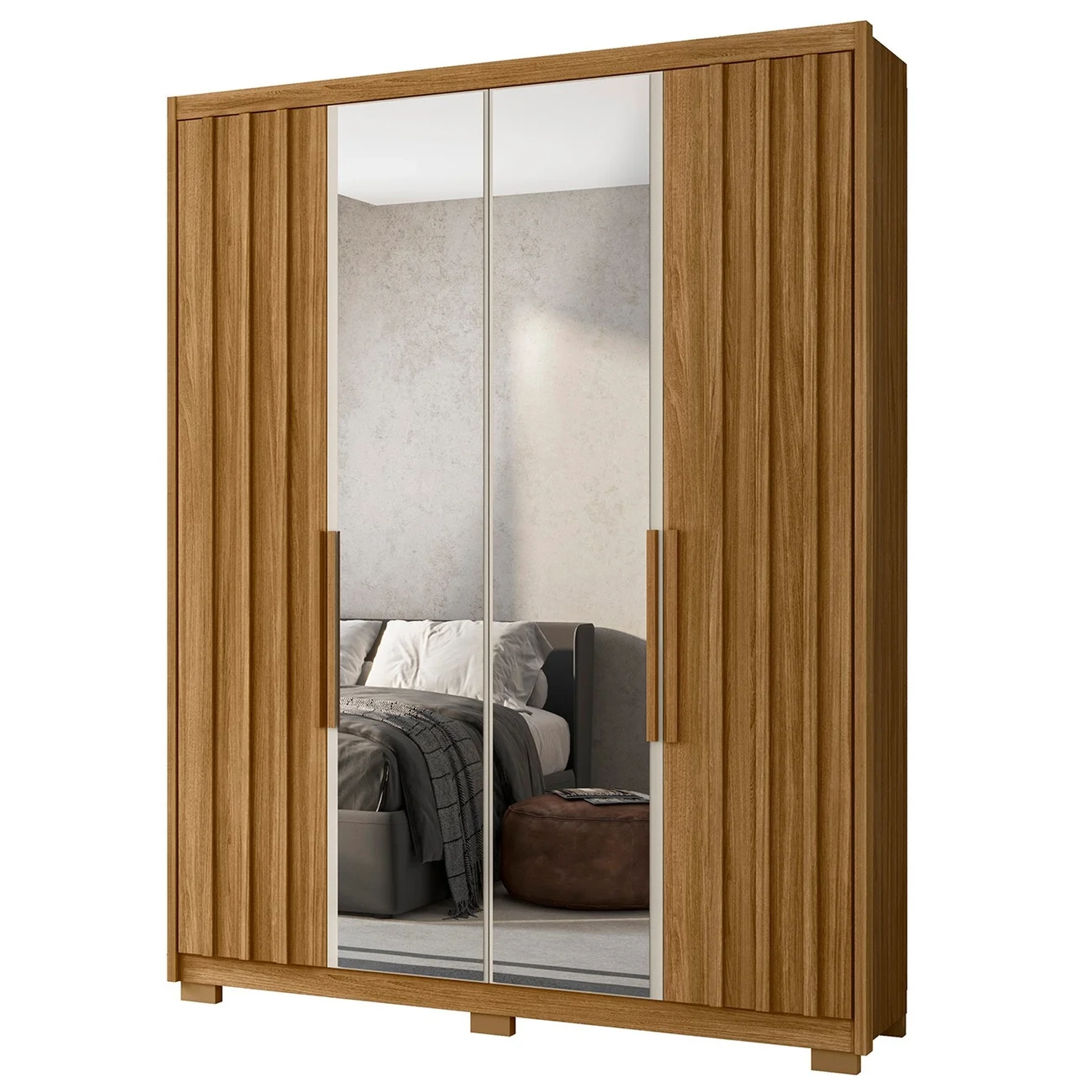 O Roupeiro possui quatro portas com puxadores de MDF e dobradiças metálicas com amortecedor, que proporcionam um fechamento sem impactos e prolongam a vida útil do Guarda Roupa Solteiro. Seu amplo espaço interno conta com seis prateleiras para acomodar seus itens de maneira prática e organizada. Dispõe de dois cabideiros em alumínio, sendo um para roupas em geral e outro para peças longas, como vestidos e casacos, de modo que suas roupas fiquem sempre bem organizadas e sem amassar. Além de três gavetas com corrediças telescópicas para acessórios, roupas dobradas, dentre outros objetos, e uma área adicional para guardar calçados. O Espelho presente nas portas centrais garante utilidade e estilo, servindo para você conferir o visual antes de sair e ainda cria uma sensação de amplitude no ambiente. Os detalhes ripados nas portas conferem sofisticação e modernidade ao design do produto, enquanto os pés em PVC facilitam a limpeza, mantendo tudo sempre impecável. Com estrutura em MDP/MDF de 12/15/25mm e acabamento em pintura UV, esse Guarda Roupa une beleza, resistência e organização, sendo a escolha ideal para otimizar e agregar funcionalidade ao seu Quarto. Não perca a oportunidade de transformar seu espaço com este móvel completo e versátil.