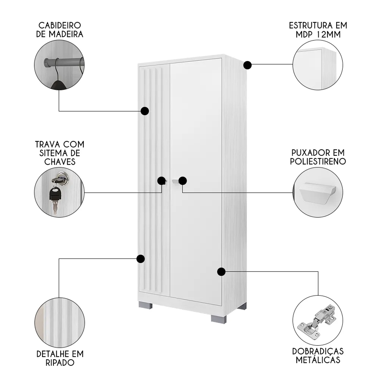 Tem um quarto pequeno e não sabe como organizar as roupas e acessórios? Então, você precisa conhecer o Guarda Roupa Solteiro 2 Portas com Chave Versus Carvalho Branco/Branco, da Incorplac.