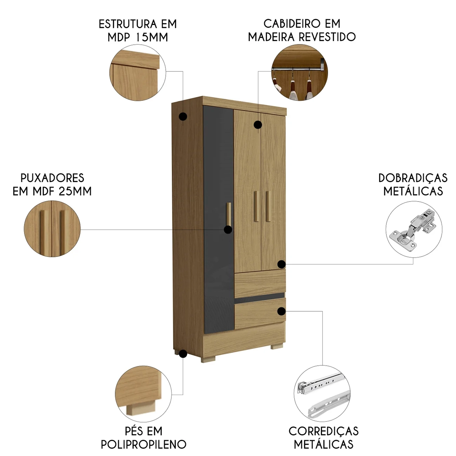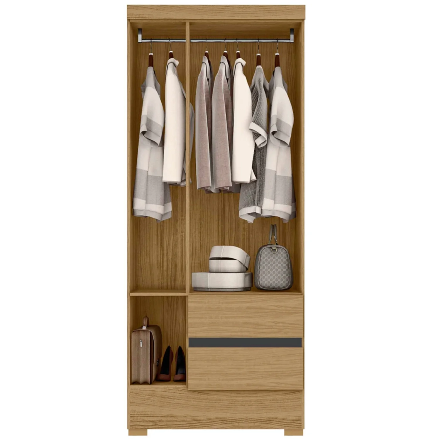 O Roupeiro Moderno traz uma prateleira interna e duas gavetas com corrediças metálicas, que deslizam suave e com segurança, o cabideiro em madeira revestida garante mais firmeza ao acessório.