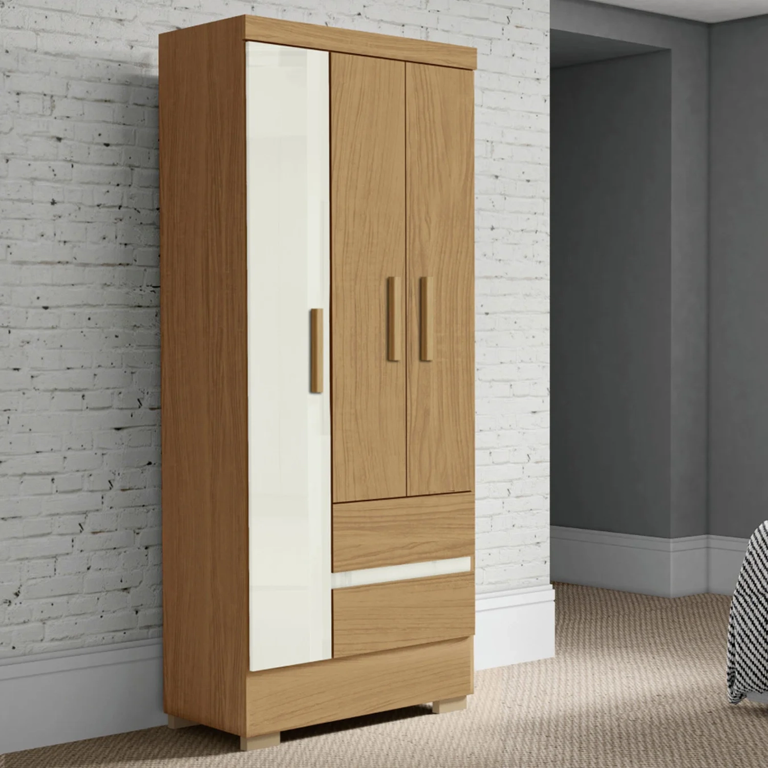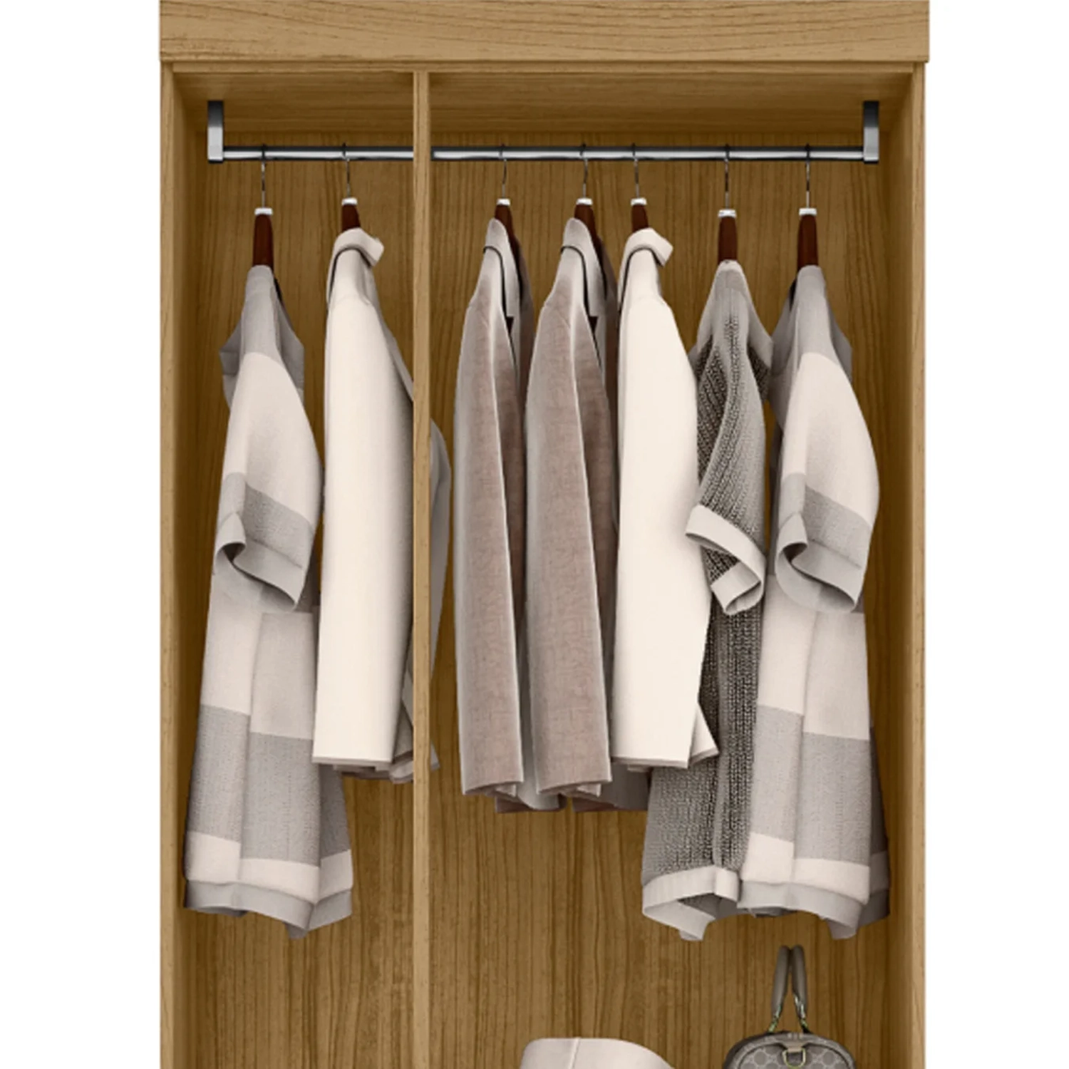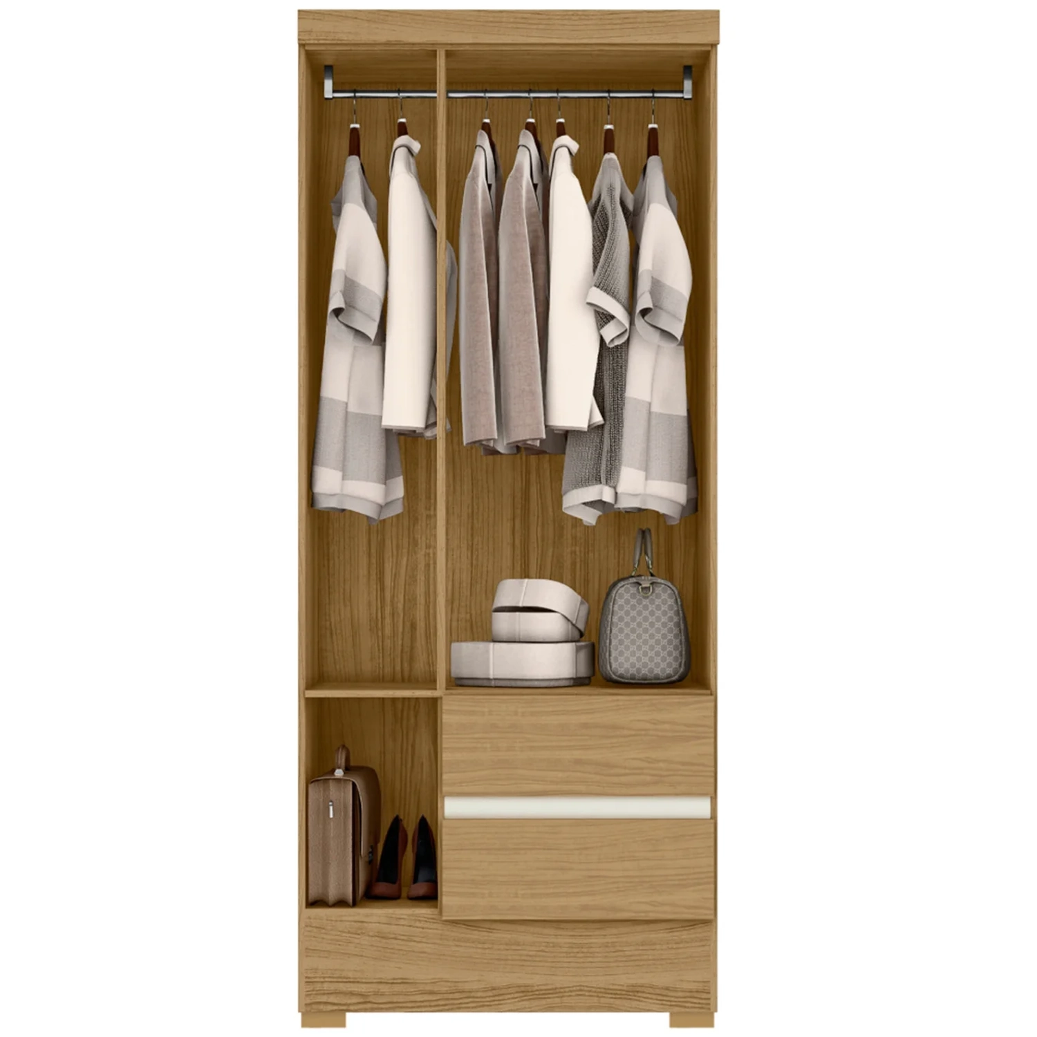 O Roupeiro Moderno traz uma prateleira interna e duas gavetas com corrediças metálicas, que deslizam suave e com segurança, o cabideiro em madeira revestida garante mais firmeza ao acessório.