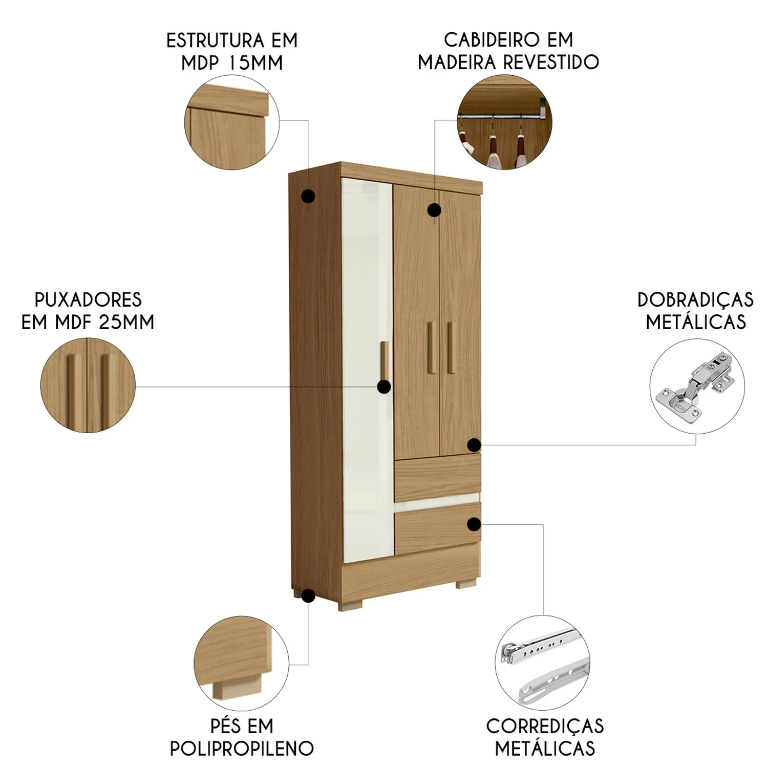 Com uma boa longevidade, este Guarda Roupa conta com dobradiças metálicas em suas portas, seus puxadores em MDF e pés em polipropileno deixam o móvel mais leve, resistente e prático para o uso.
