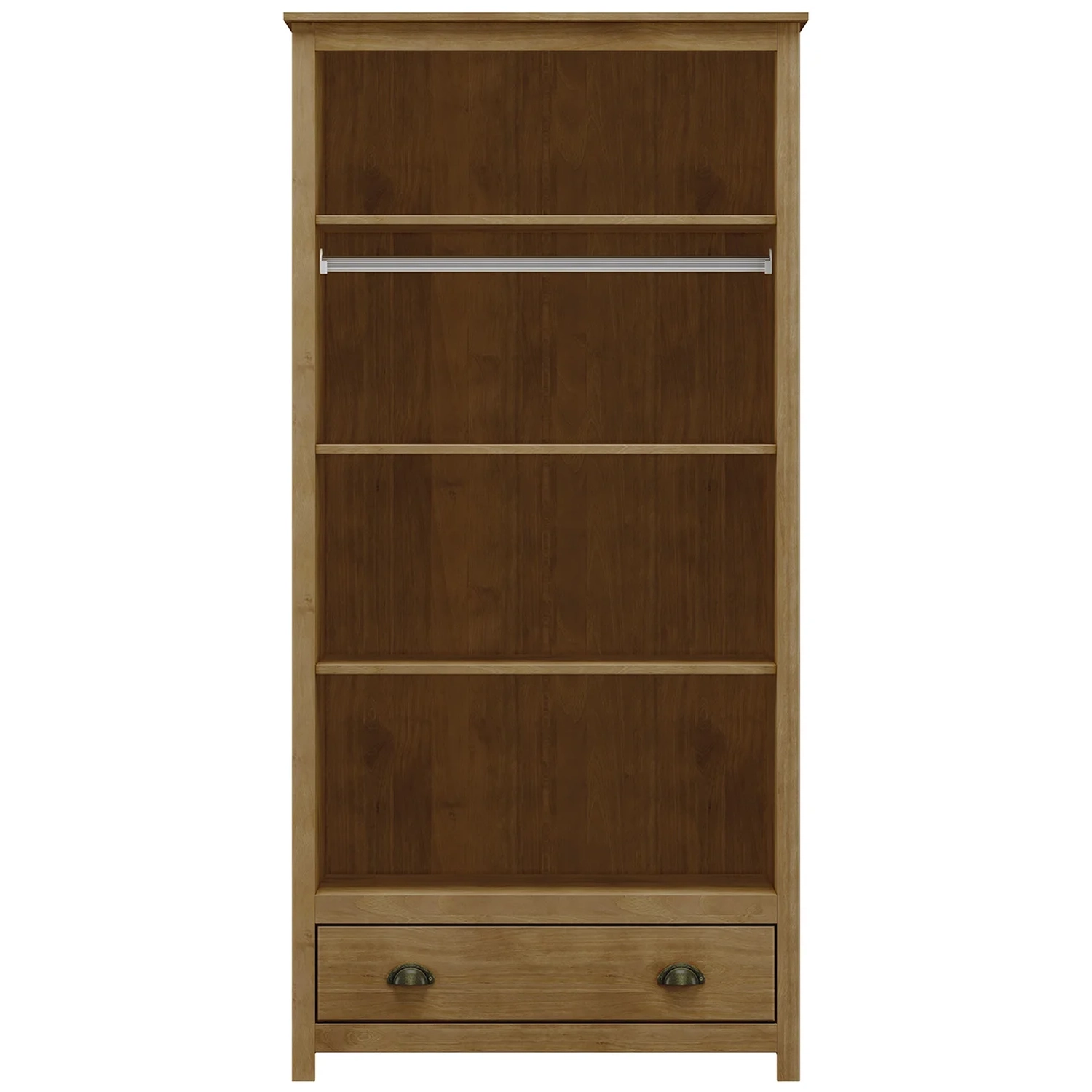 O Guarda Roupa acompanha três prateleiras em madeira maciça e um cabideiro de alumínio. A prateleira superior é fixa, enquanto as inferiores podem ser removidas, oferecendo flexibilidade de uso conforme a necessidade.