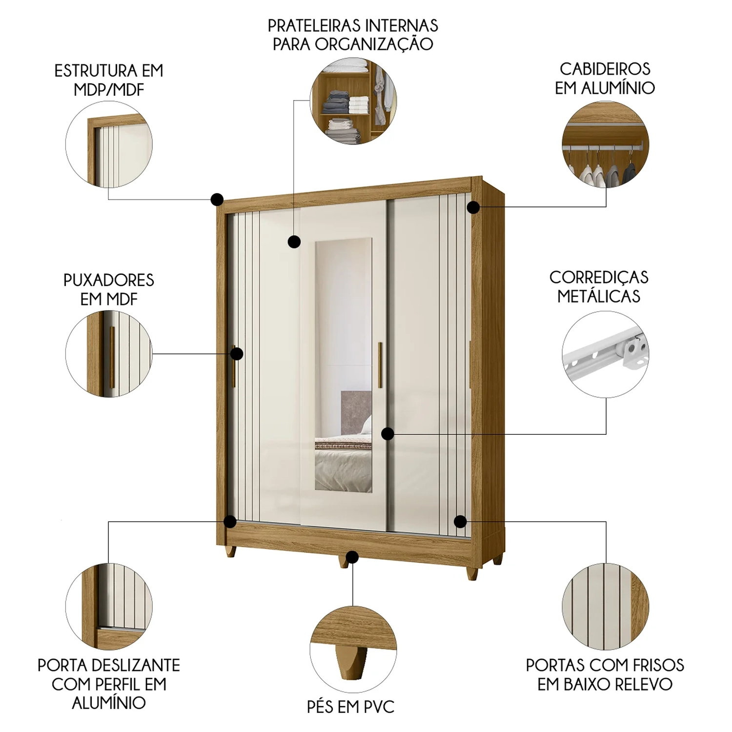 As três portas deslizantes, com trilho de alumínio, garantem um uso suave e sem ocupar o espaço de circulação, elas ainda apresentam detalhes em frisos de baixo relevo, que adicionam um toque de modernidade ao produto. Seu interior é projetado para oferecer excelente repartição, com três prateleiras para acomodar seus itens de maneira prática e organizada. Ele conta com dois cabideiros e um calceiro em alumínio, ideais para pendurar roupas de forma eficiente, além de duas gavetas com corrediças metálicas para acessórios, roupas dobradas, dentre outros objetos, e uma área adicional para guardar calçados. O Espelho presente na porta central proporciona utilidade e estilo, servindo para conferir o visual antes de sair e ainda cria uma sensação de amplitude no ambiente. Os puxadores em MDF conferem delicadeza e sofisticação ao design do Guarda Roupa Solteiro, enquanto os pés em PVC facilitam a limpeza, mantendo tudo sempre impecável. Com estrutura em MDP/MDF de 12/15mm e acabamento em pintura UV, esse Roupeiro une beleza, resistência e organização, sendo a escolha ideal para otimizar e agregar funcionalidade ao seu Quarto. Não perca a oportunidade de transformar seu espaço com este móvel completo e versátil.