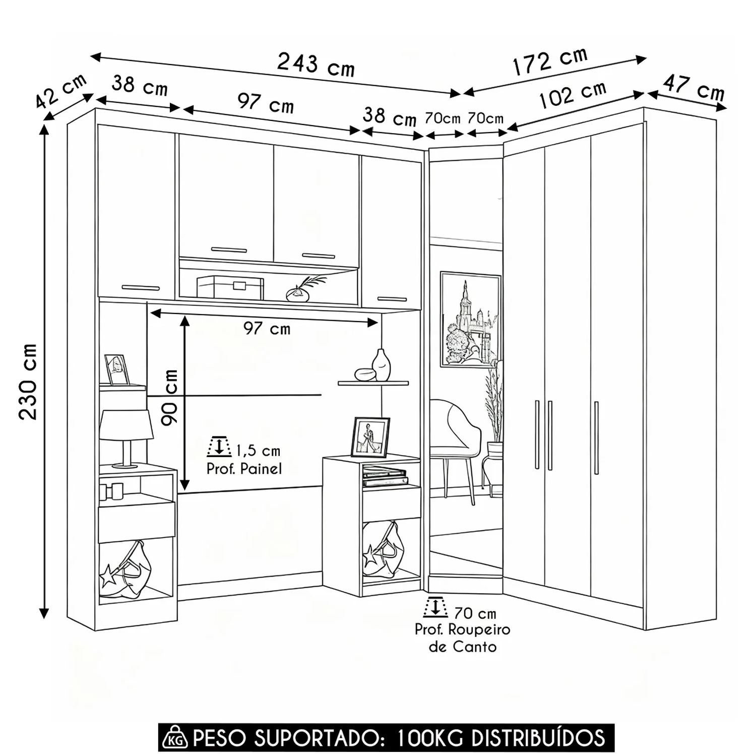 Peso Suportado Distribuído: Guarda Roupa 30Kg/Canto Oblíquo 25Kg/Mesa Cabeceira 15Kg cada/Armário Aéreo 15Kg.