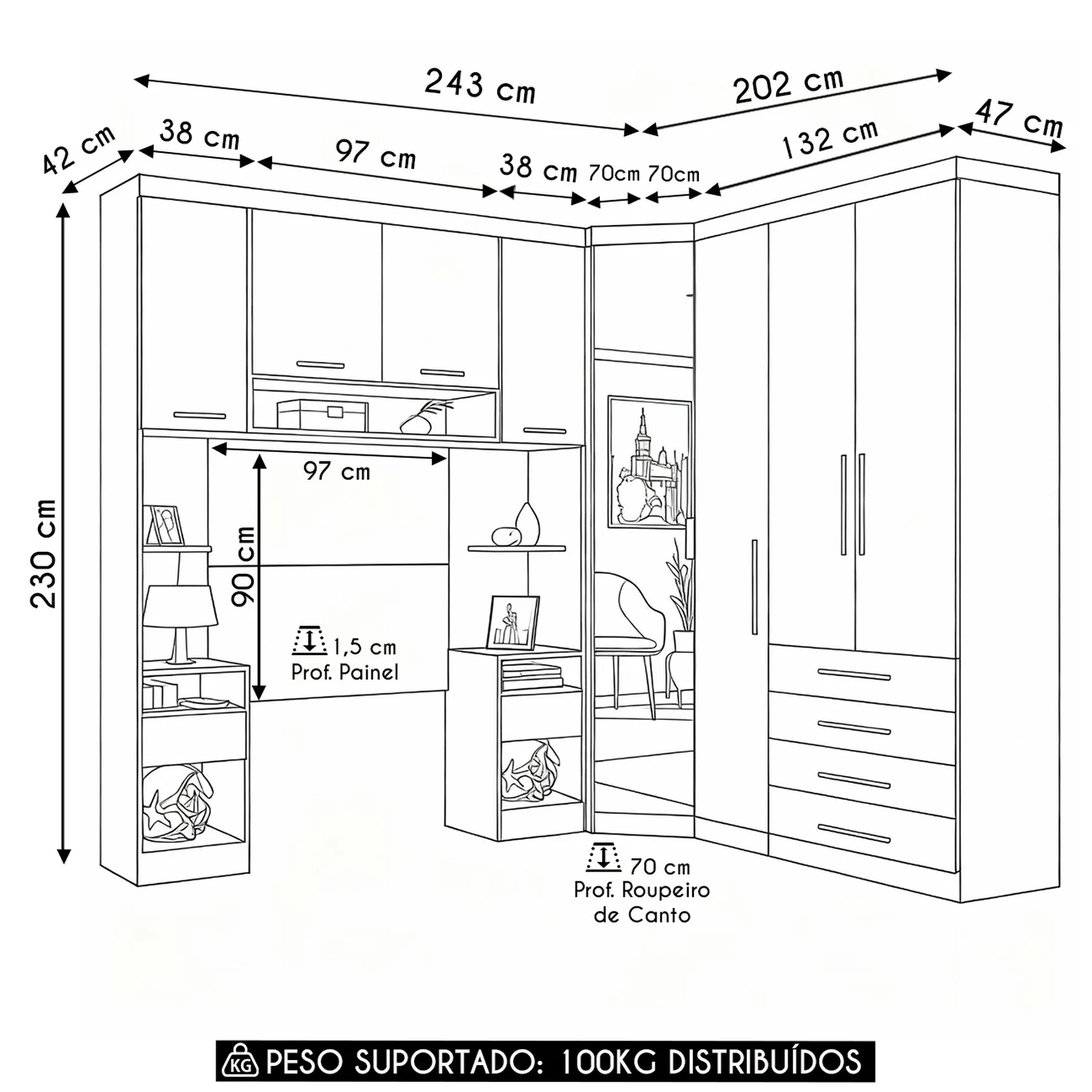 Conteúdo da Embalagem: 1 Guarda Roupa, 1 Canto Oblíquo, 2 Mesas Cabeceira Alta, 1 Armário Aéreo, 2 Painéis Cabeceira.