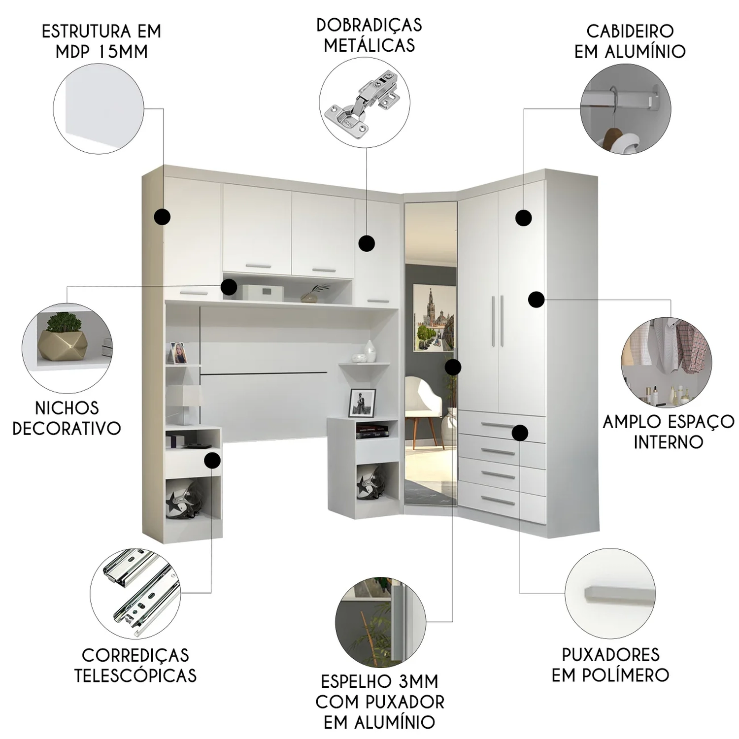 Conteúdo da Embalagem: 1 Guarda Roupa, 1 Canto Oblíquo, 2 Mesas Cabeceira Alta, 1 Armário Aéreo, 2 Painéis Cabeceira.