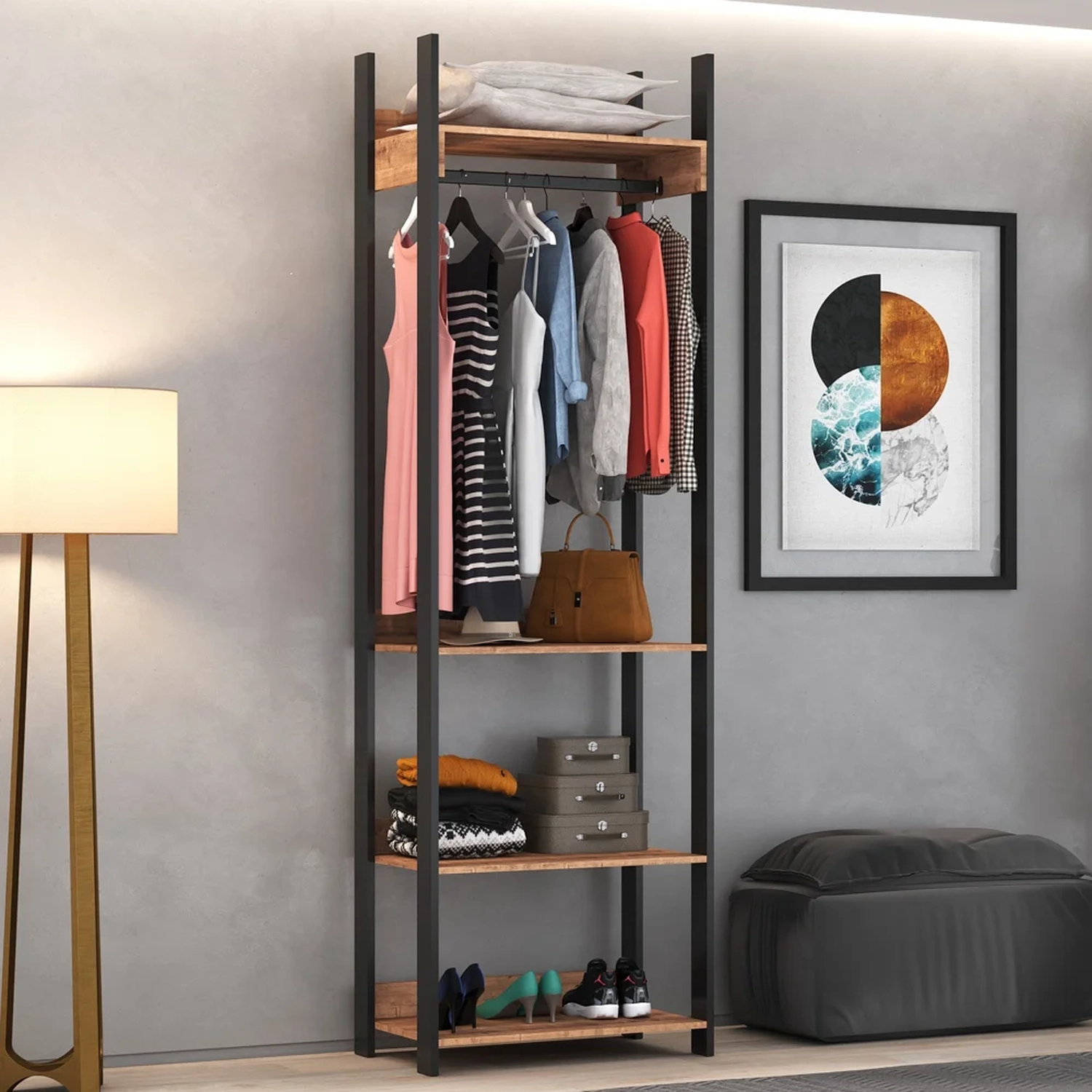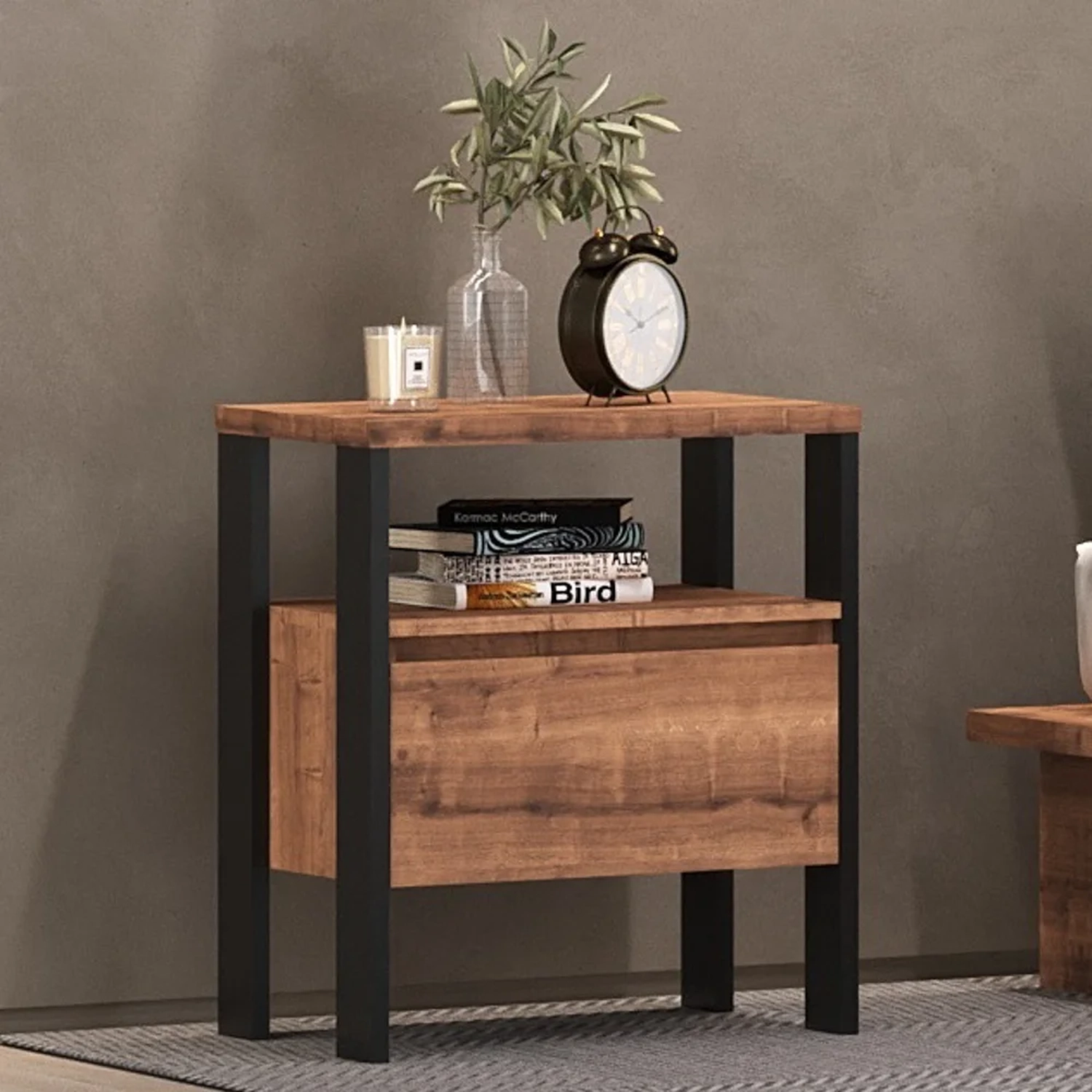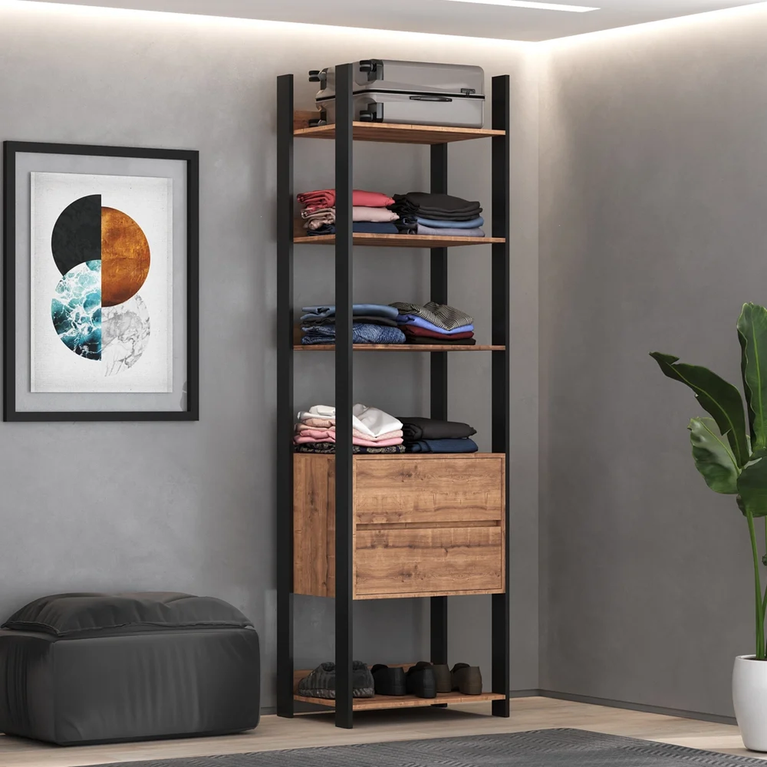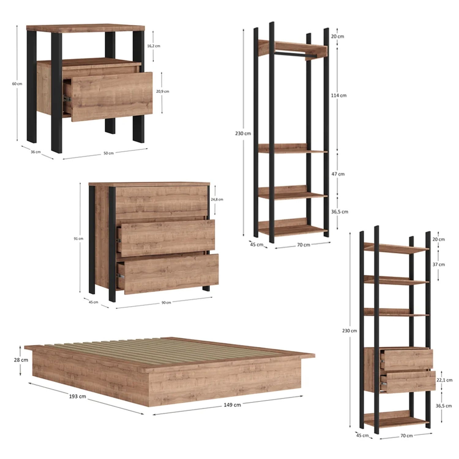 Esse jogo é composto por complementos com estrutura em MDP de qualidade e acabamento em pintura BP fosco que além de garantir durabilidade e resistência o produto, ainda contribui para um design moderno no famigerado estilo industrial. Essa composição incrível conta com cama de casal, 2 mesas de cabeceira, closet e cômoda, isto é, o essencial para um quarto aconchegante e muito bem organizado.