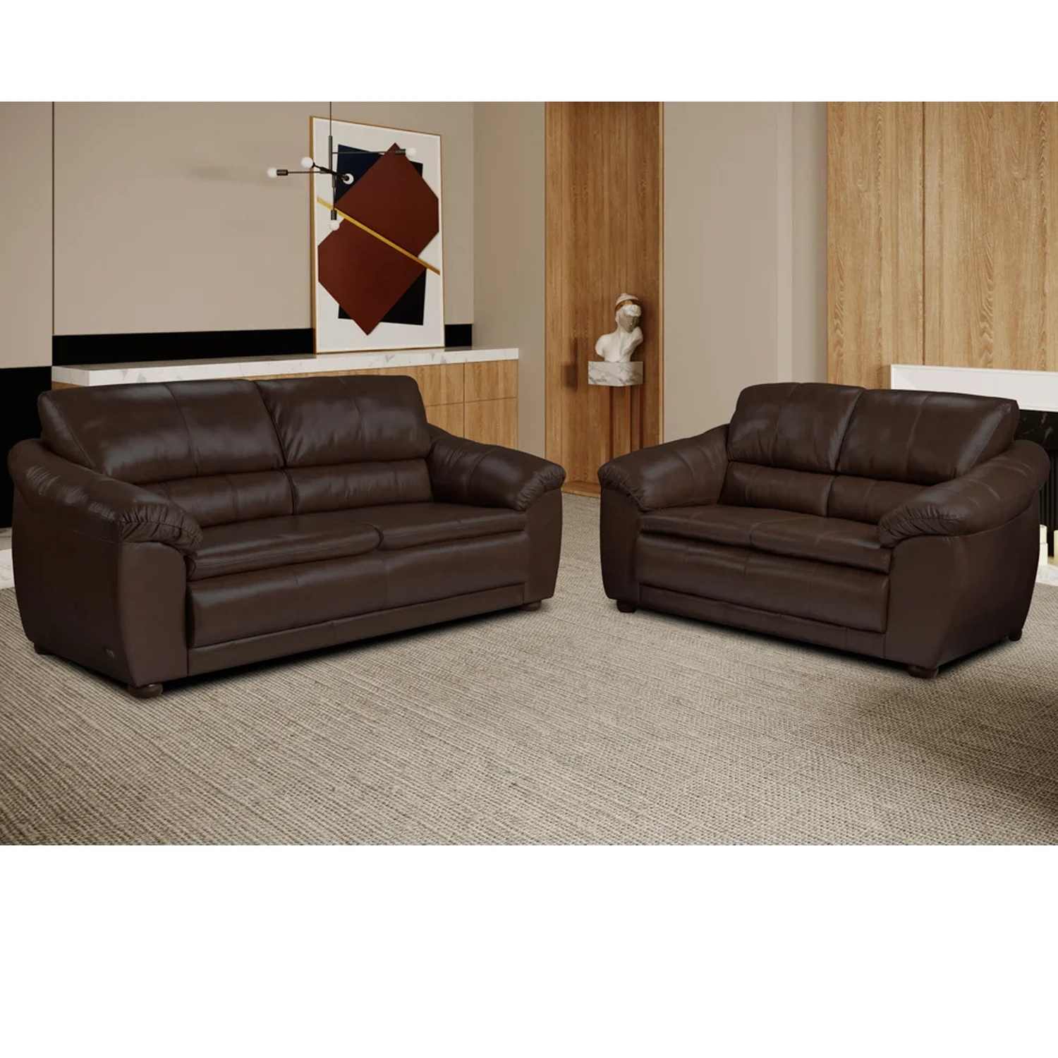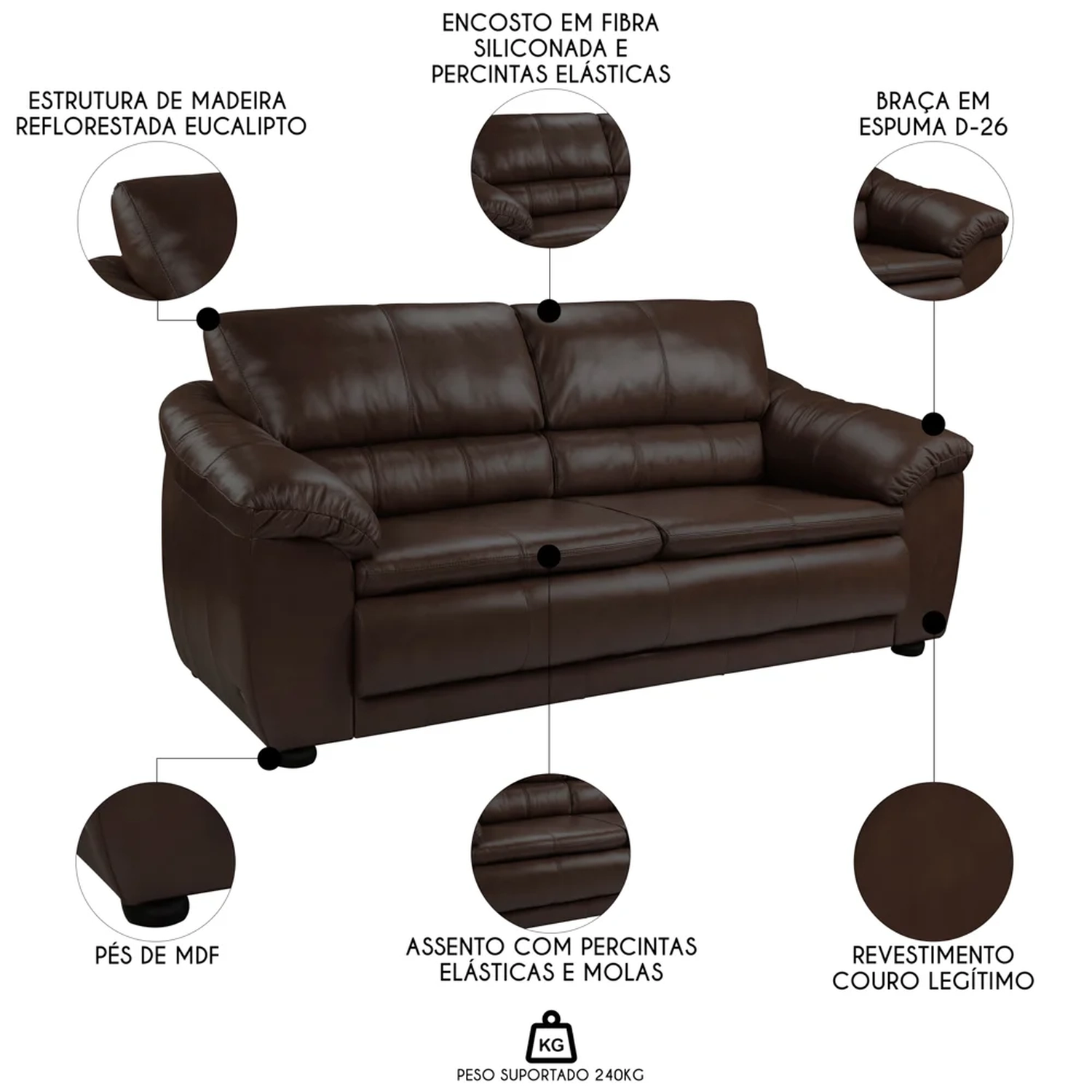 Com estrutura em madeira tratada, pés em madeira e revestimento em couro legítimo de alto padrão, o conjunto garante durabilidade, resistência e um toque sofisticado ao ambiente.