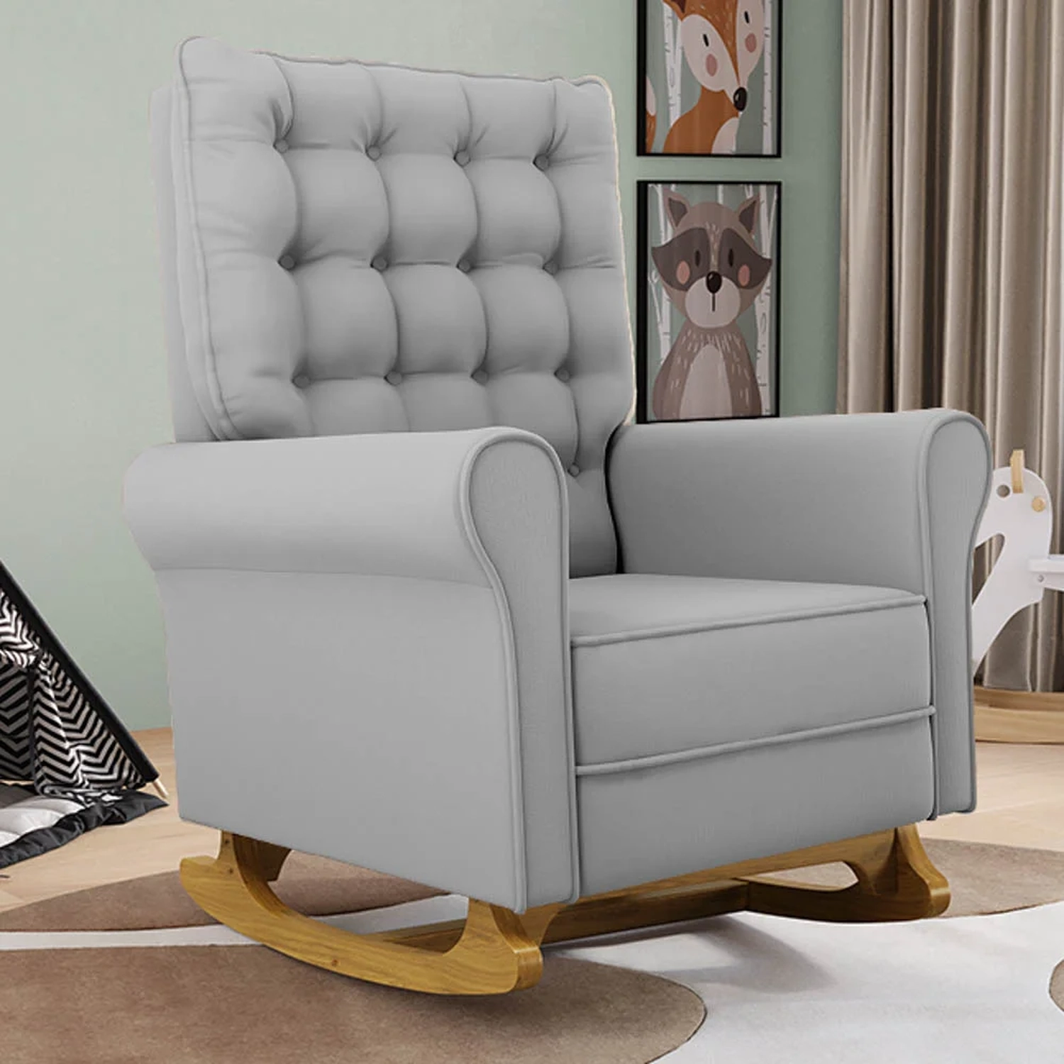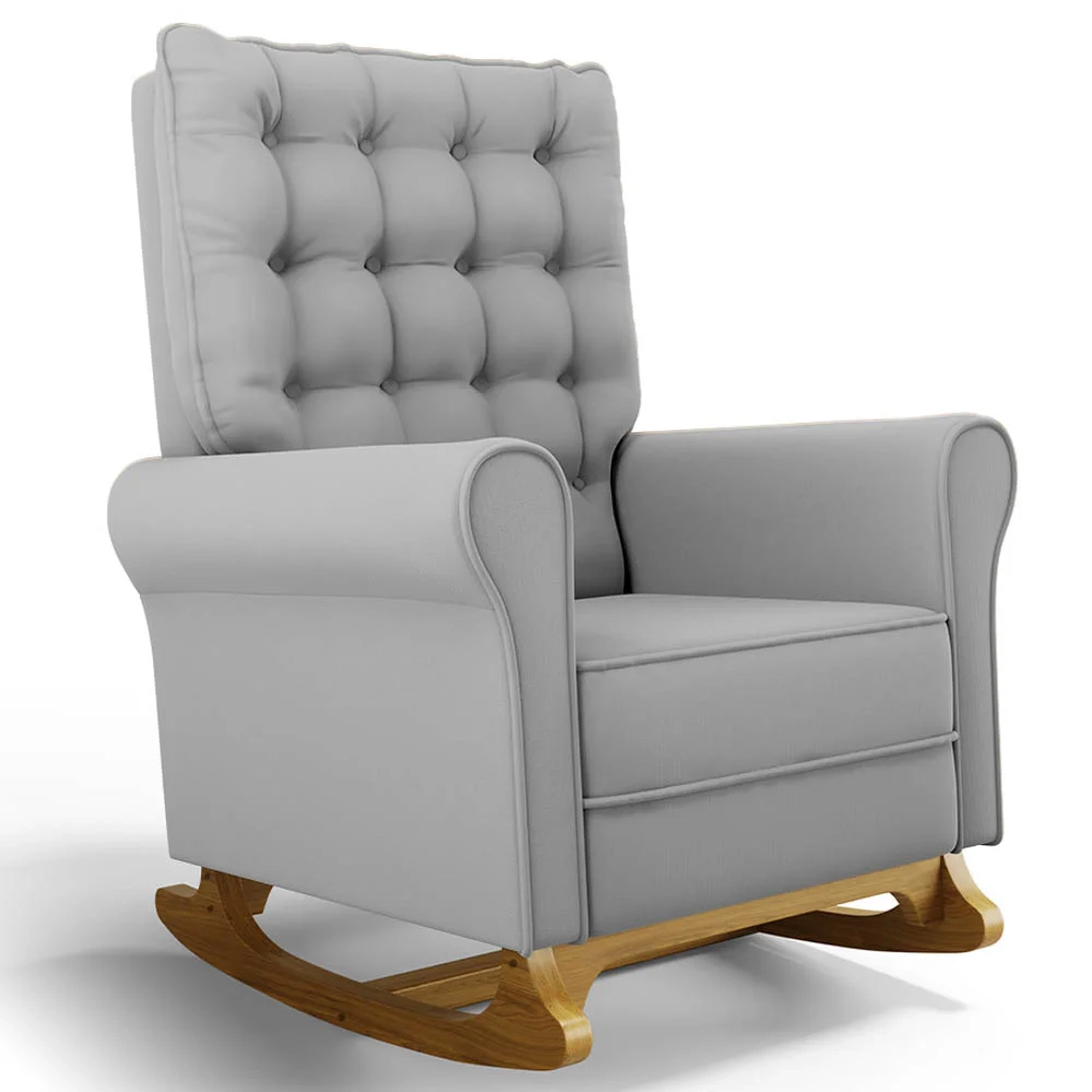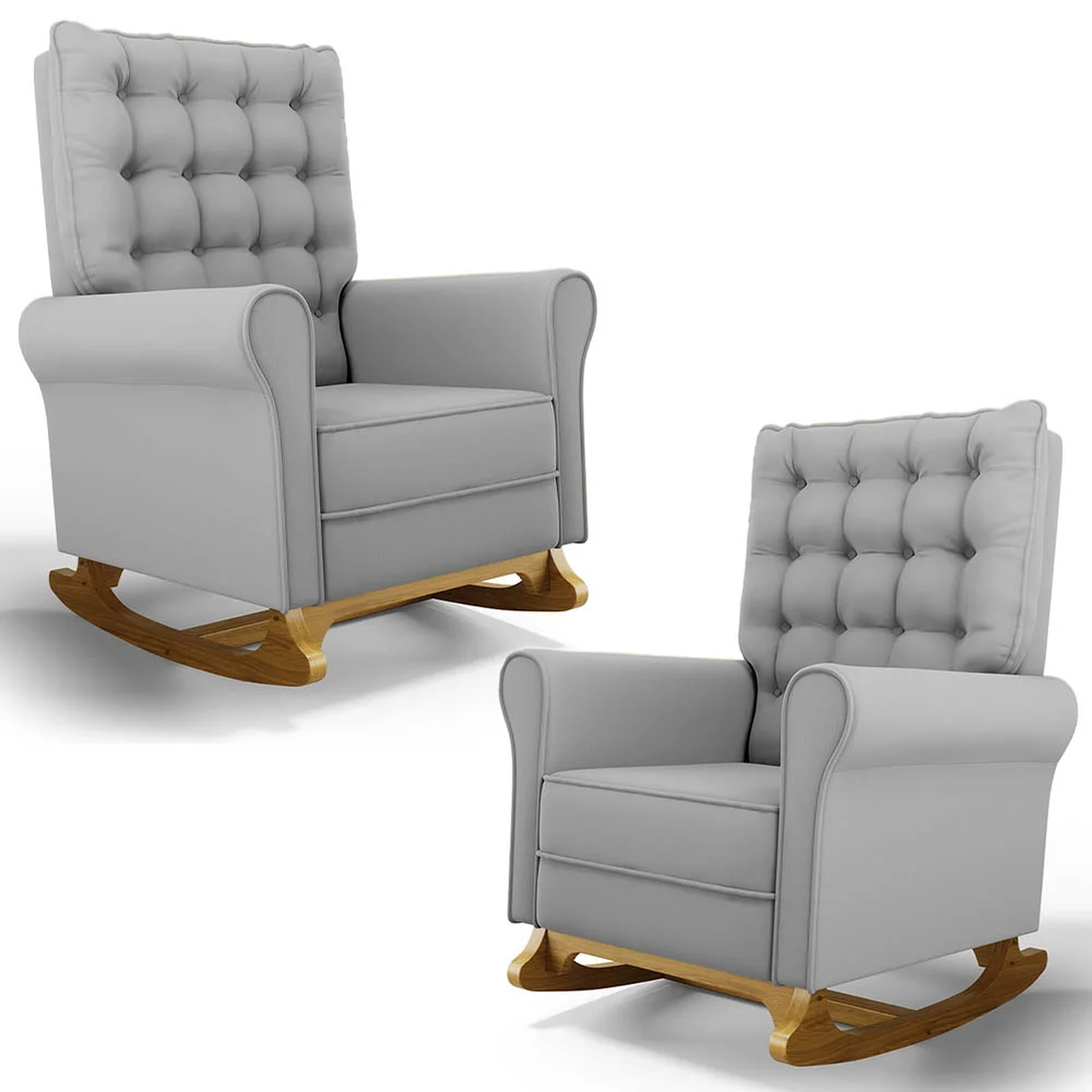 As Poltronas de Balanço são feitas com materiais de alta qualidade, estrutura em madeira de eucalipto, o tecido Veludo macio e resistente, e a espuma D23 a densidade ideal para o seu conforto, base em madeira com um lindo design e balanço suave, que ajuda a relaxar e a embalar o sono do seu bebê. Além disso, o Kit 2 Poltronas possui um design moderno e sofisticado, com detalhes em botonê revestido no encosto, que dão um toque de charme e elegância ao ambiente.
