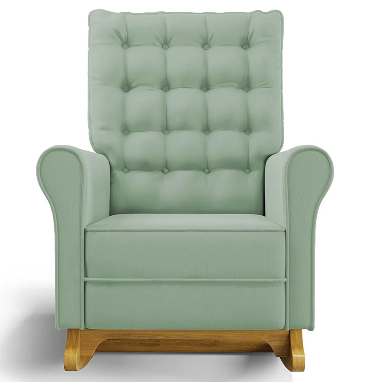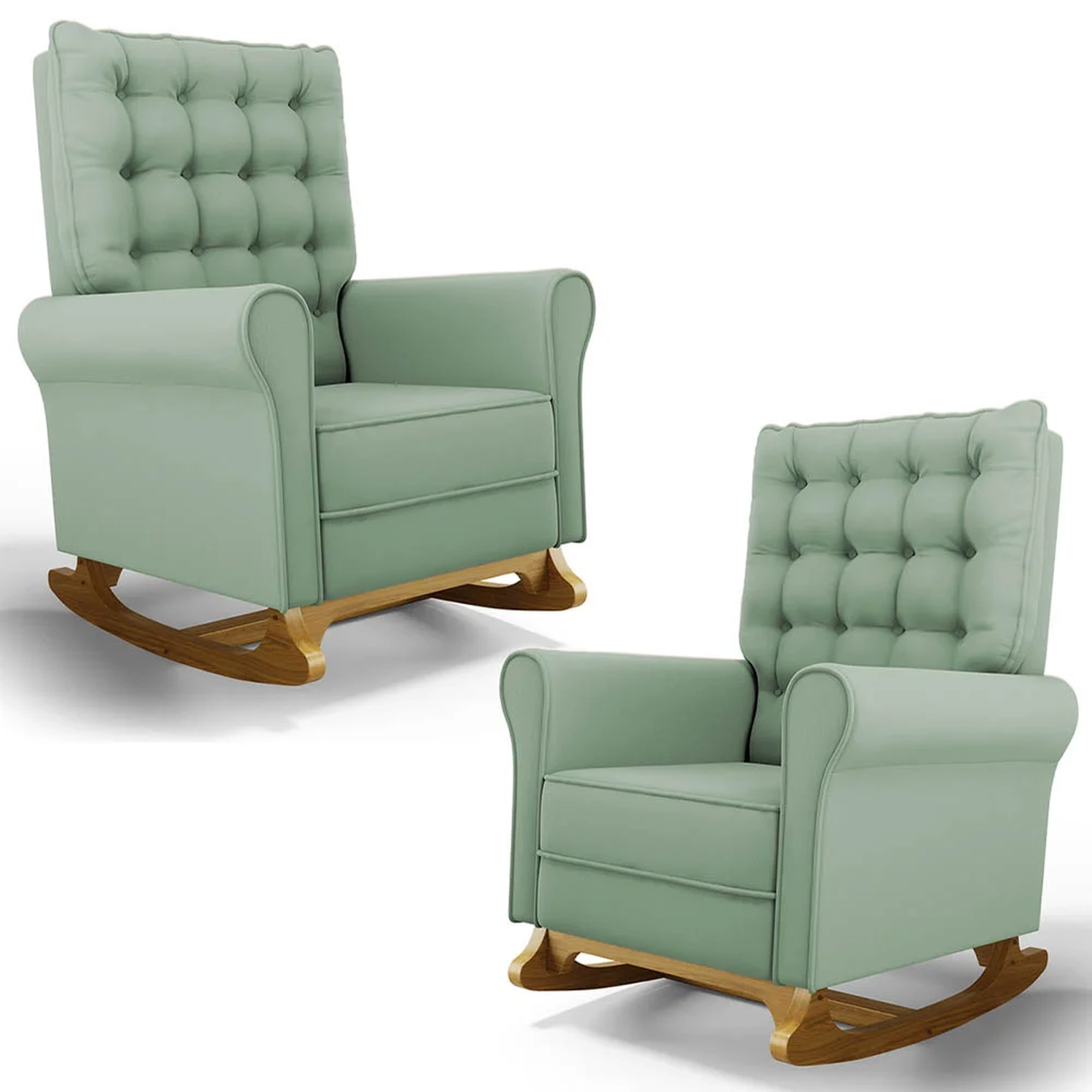 As Poltronas de Balanço são feitas com materiais de alta qualidade, estrutura em madeira de eucalipto, o tecido Veludo macio e resistente, e a espuma D23 a densidade ideal para o seu conforto, base em madeira com um lindo design e balanço suave, que ajuda a relaxar e a embalar o sono do seu bebê. Além disso, o Kit 2 Poltronas possui um design moderno e sofisticado, com detalhes em botonê revestido no encosto, que dão um toque de charme e elegância ao ambiente.