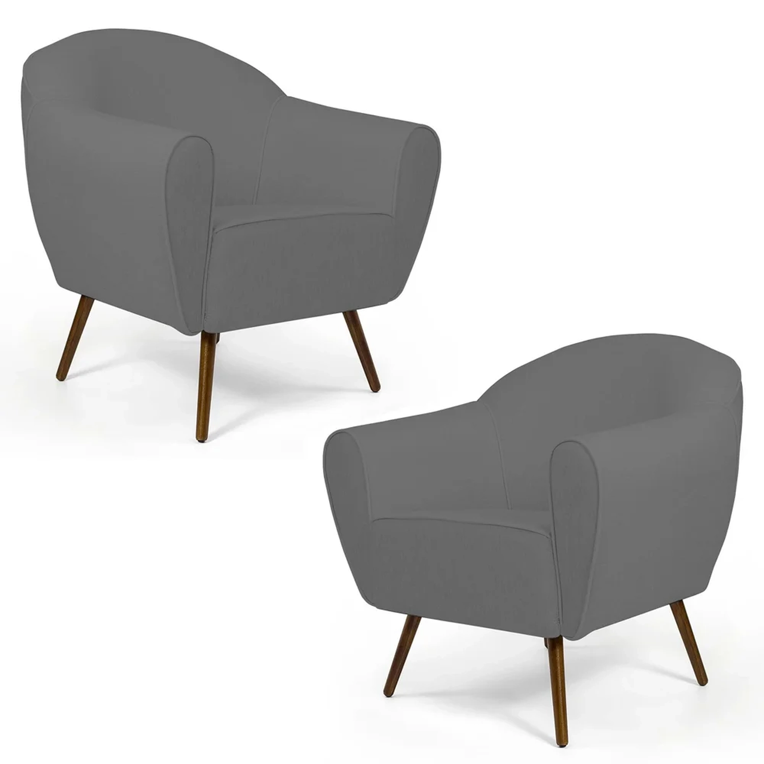 Kit 02 Poltronas Decorativas Nina Pés Palito Madeira C-416 Linho Cinza Escuro - Domi 660043814
