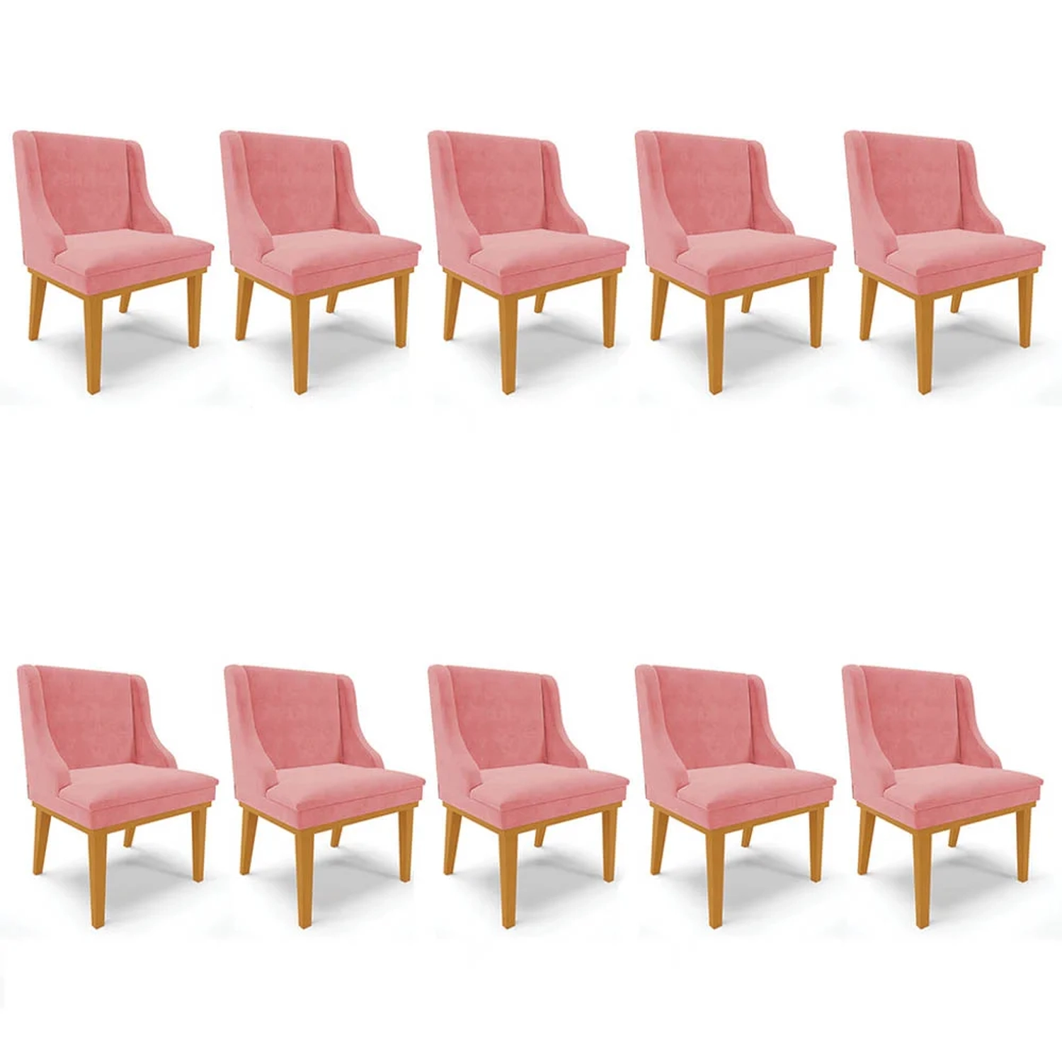 Para quem procura conforto, qualidade e elegância, o Kit 10 Cadeiras Estofadas para Sala de Jantar Base Fixa de Madeira Castanho Lia Suede Rosê, da Ibiza, é a escolha certeira!