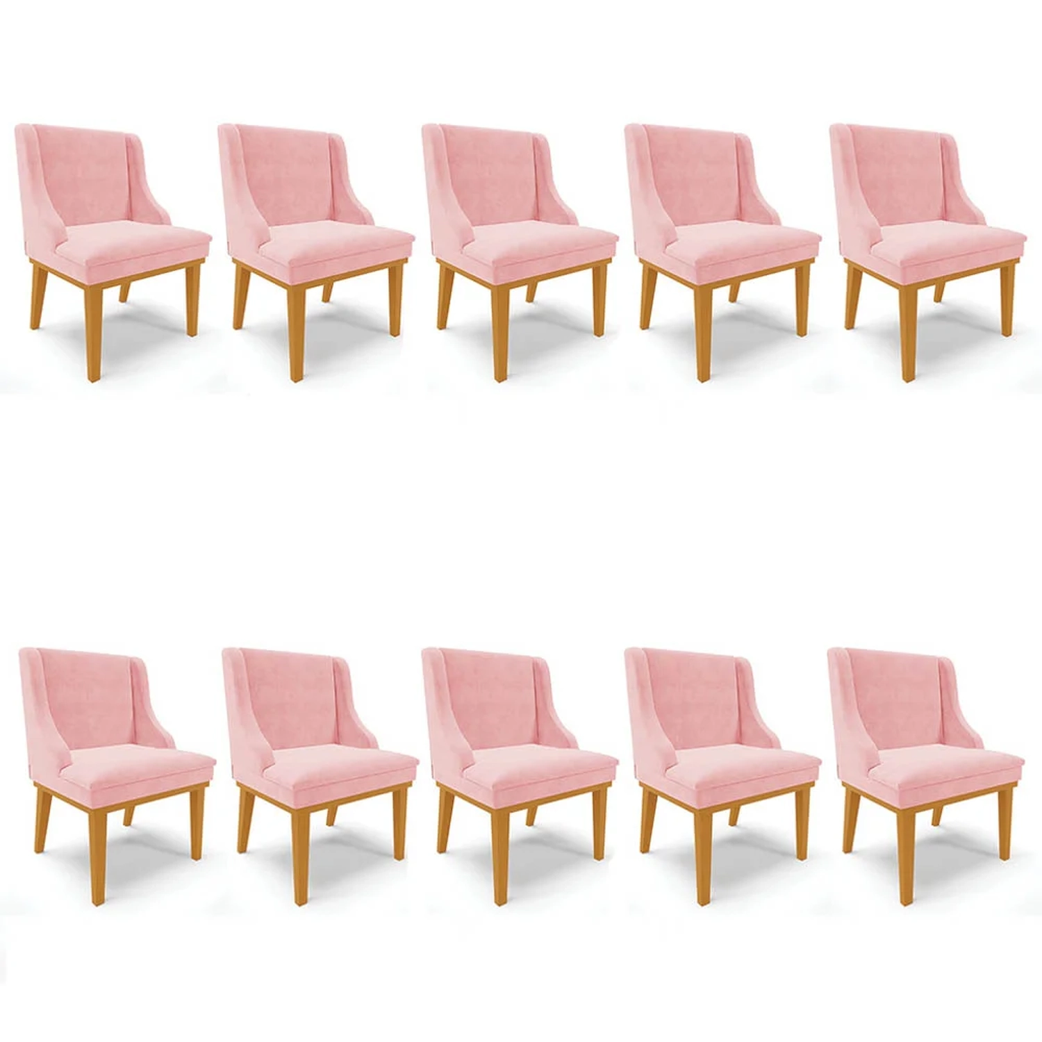 Para quem procura conforto, qualidade e elegância, o Kit 10 Cadeiras Estofadas para Sala de Jantar Base Fixa de Madeira Castanho Lia Suede Rosa bebê, da Ibiza, é a escolha certeira!