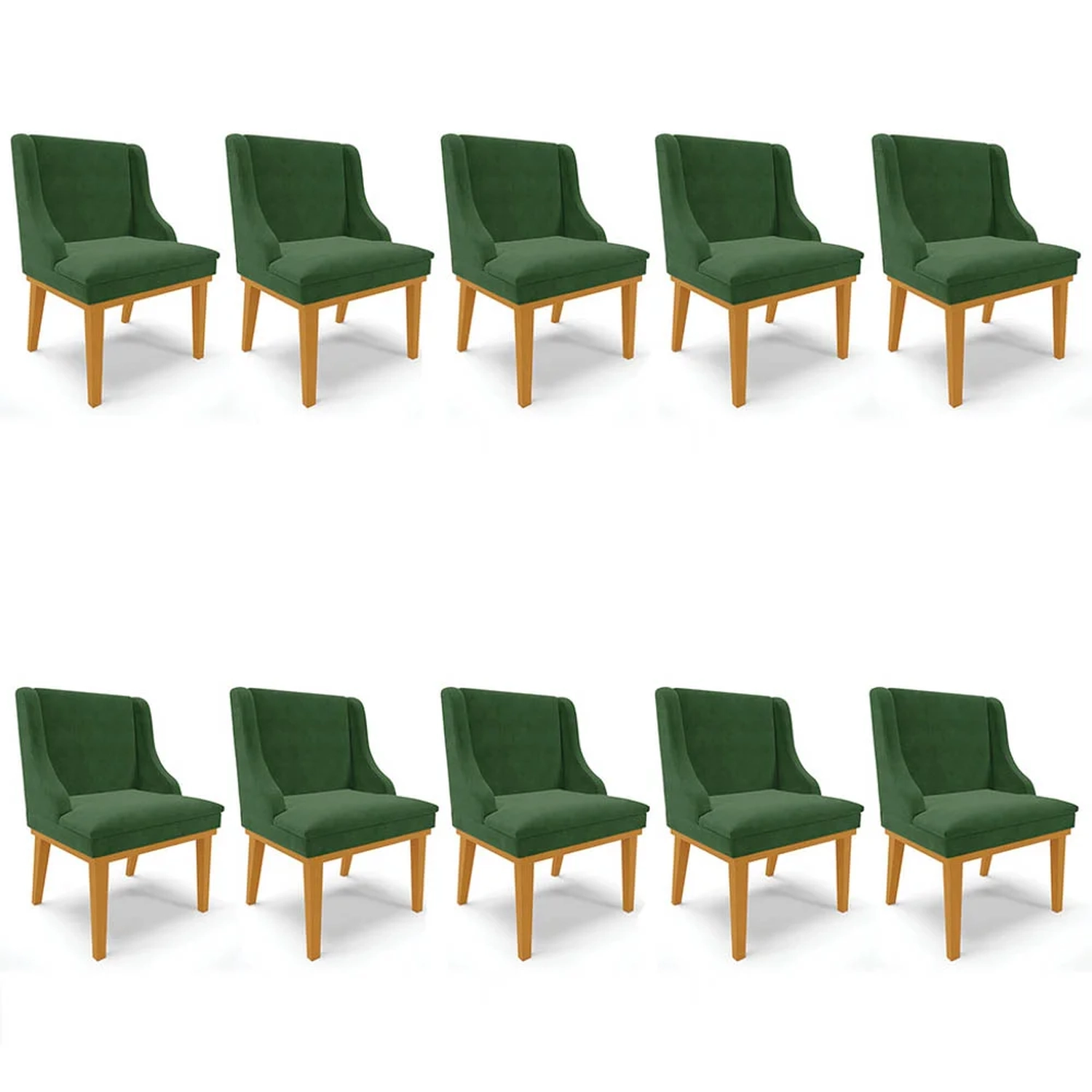 Para quem procura conforto, qualidade e elegância, o Kit 10 Cadeiras Estofadas para Sala de Jantar Base Fixa de Madeira Castanho Lia Suede Verde, da Ibiza, é a escolha certeira!
