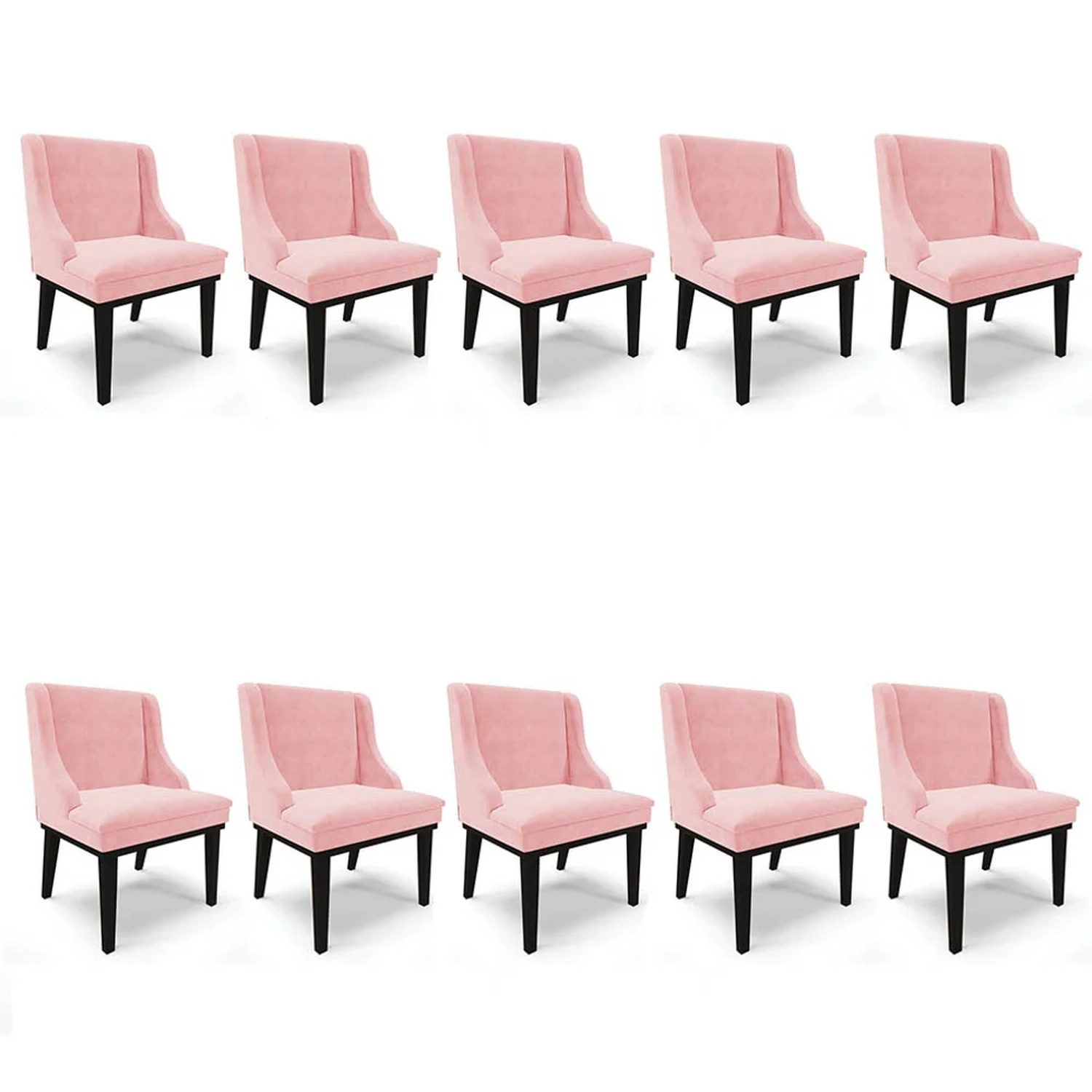 Procurando móveis confortáveis e resistentes? Conheça o Kit 10 Cadeiras Estofadas para Sala de Jantar Base Fixa de Madeira Preto Lia Suede Rosa bebê, da Ibiza!