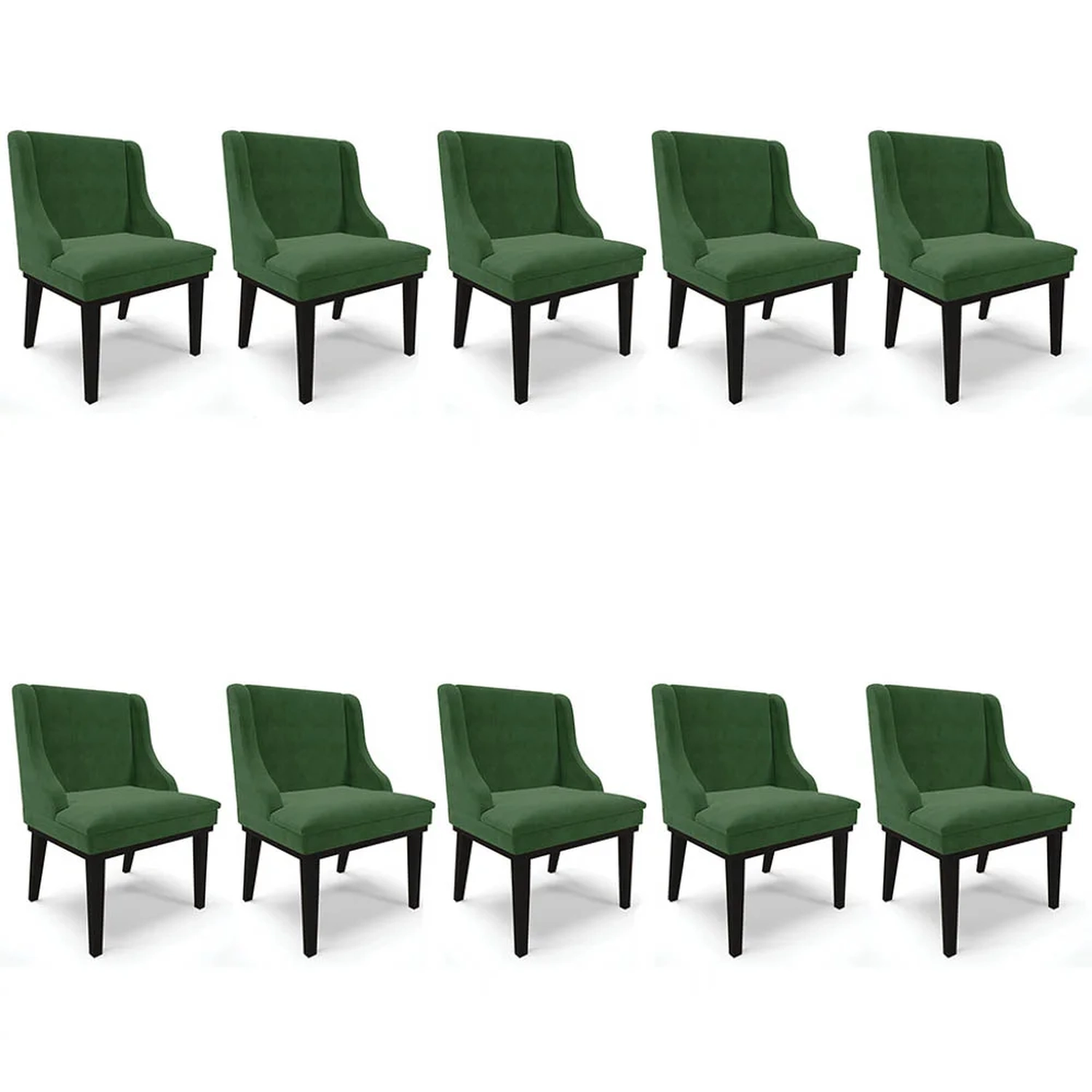 Procurando móveis confortáveis e resistentes? Conheça o Kit 10 Cadeiras Estofadas para Sala de Jantar Base Fixa de Madeira Preto Lia Suede Verde, da Ibiza!