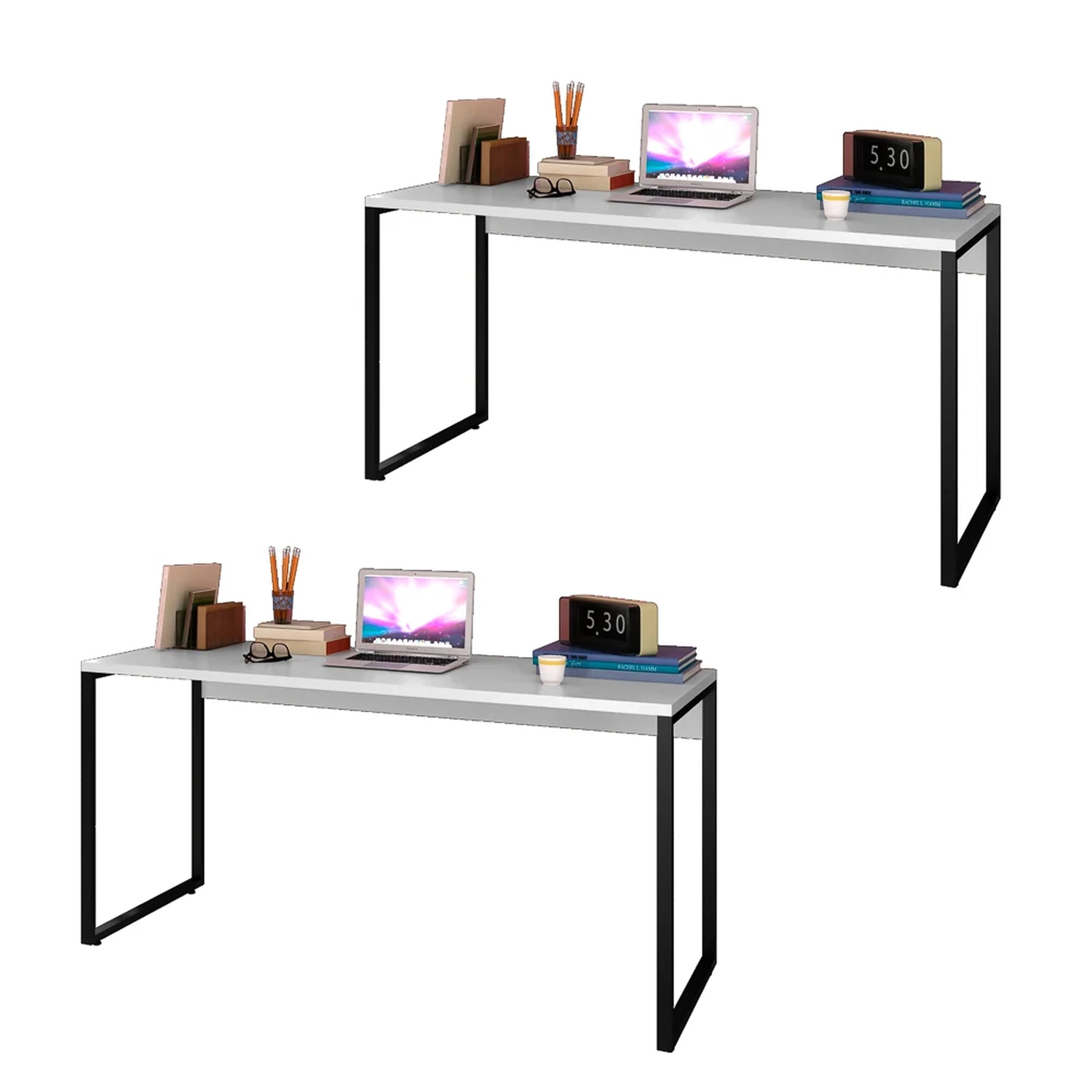 Nesse sentido, o Kit com 2 Mesas Studio Industrial, da Mpozenato, é perfeito, porque as medidas compactas com 150 cm e o design slim, com pés metálicos quadro confeccionados em Tubo de Aço com pintura epóxi cor Preto e também sapatas reguláveis vão deixar qualquer lugar mais bonito, organizado e aconchegante. Já os tampos retos na cor Branco são fabricados em MDP 25mm com acabamento em BP, proporcionando maior durabilidade e resistência aos produtos.