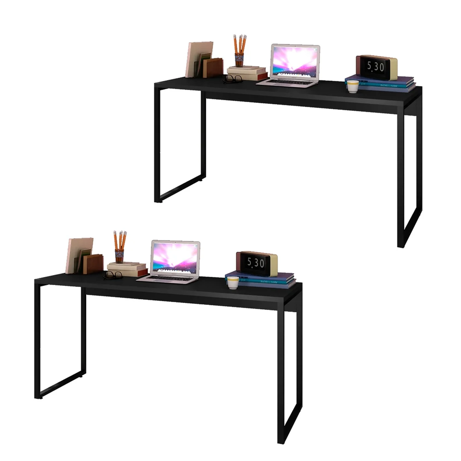Nesse sentido, o Kit com 2 Mesas Studio Industrial, da Mpozenato, é perfeito, porque as medidas compactas com 150 cm e o design slim, com pés metálicos quadro confeccionados em Tubo de Aço com pintura epóxi cor Preto e também sapatas reguláveis vão deixar qualquer lugar mais bonito, organizado e aconchegante. Já os tampos retos na cor Preto são fabricados em MDP 25mm com acabamento em BP, proporcionando maior durabilidade e resistência aos produtos.