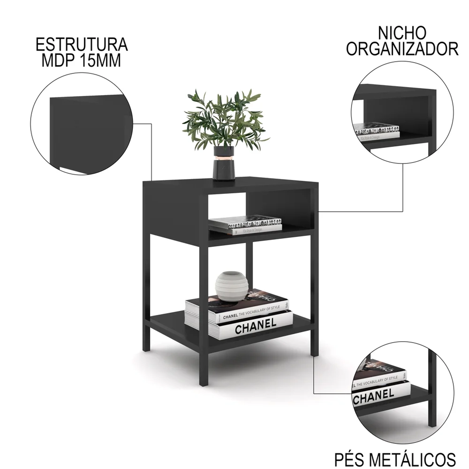 Essa tendência é perfeita para quem gosta de um ambiente moderno, despojado e cheio de personalidade. A Mesa De Cabeceira Industrial é feita de 100% MDP, um material resistente e ecologicamente correto, e tem pés de estrutura metálica, que garantem a estabilidade e o charme do móvel. Além disso, ela tem um acabamento em melamina BP, que protege contra riscos, manchas e umidade. A Mesa De Lateral tem um nicho espaçoso, ideal para guardar livros, revistas, óculos ou o que mais você precisar. E ainda tem uma prateleira inferior, que pode ser usada para colocar objetos decorativos, como vasos, quadros ou luminárias. O Kit Mesas De Cabeceira é sem dúvidas O que faltava para deixar o seu quarto mais bonito, funcional e aconchegante.