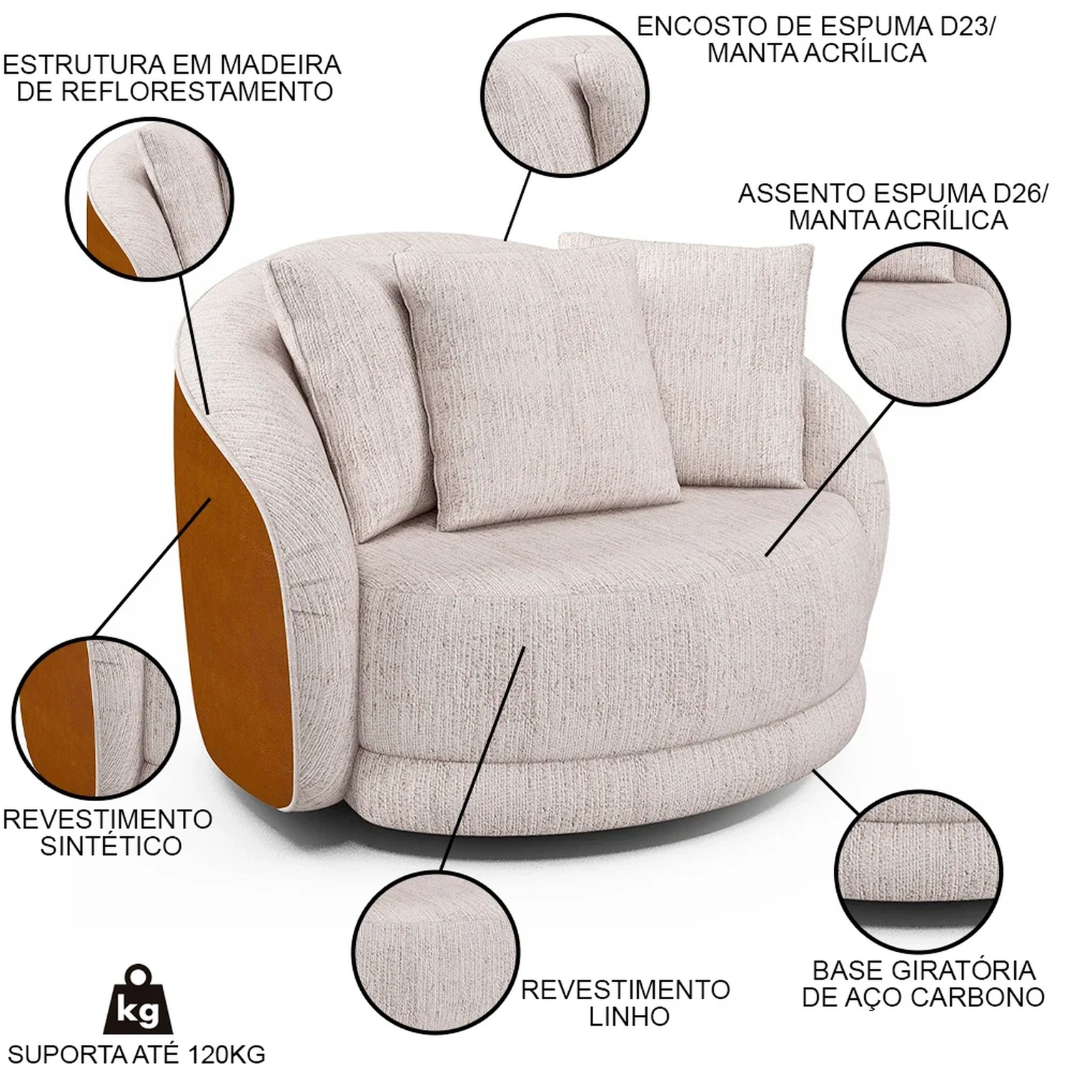 O design redondo com almofadas soltas faz com que essa poltrona moderna complemente a decoração da sua sala de estar, além de oferecer o máximo de aconchego, dando a sensação de estar sendo abraçado por ela. E tudo isso, graças à estrutura robusta com madeira maciça imunizada contra mofo, cupim e micro-organismo. Já a maciez do estofado fica por conta das espumas de alta densidade, reforçadas com cintas elásticas de alta resistência. Para completar, base giratória agrega muito mais funcionalidade e, ainda, dá aquele toque de charme.