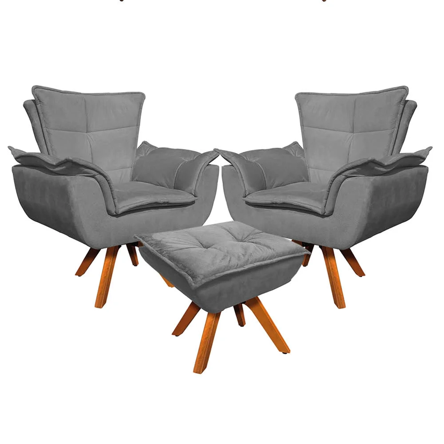 O Kit 2 Poltronas Decorativas e o Puff Opla são mais do que complementos, são justamente para te oferecer aconchego e praticidade. Ela são produtos super versáteis, proporcionando conforto e elegância. Podem ser utilizadas na sala de estar, quarto, escritório ou recepção, afinal seu design retrô combina com qualquer ambiente. Estrutura em madeira de eucalipto e espuma de alta qualidade, tudo para garantir durabilidade e resistência. Ah, percintas elásticas deixam o assento ainda mais reforçado e seu revestimento em tecido Suede transmite maciez ao toque. Show, concorda?