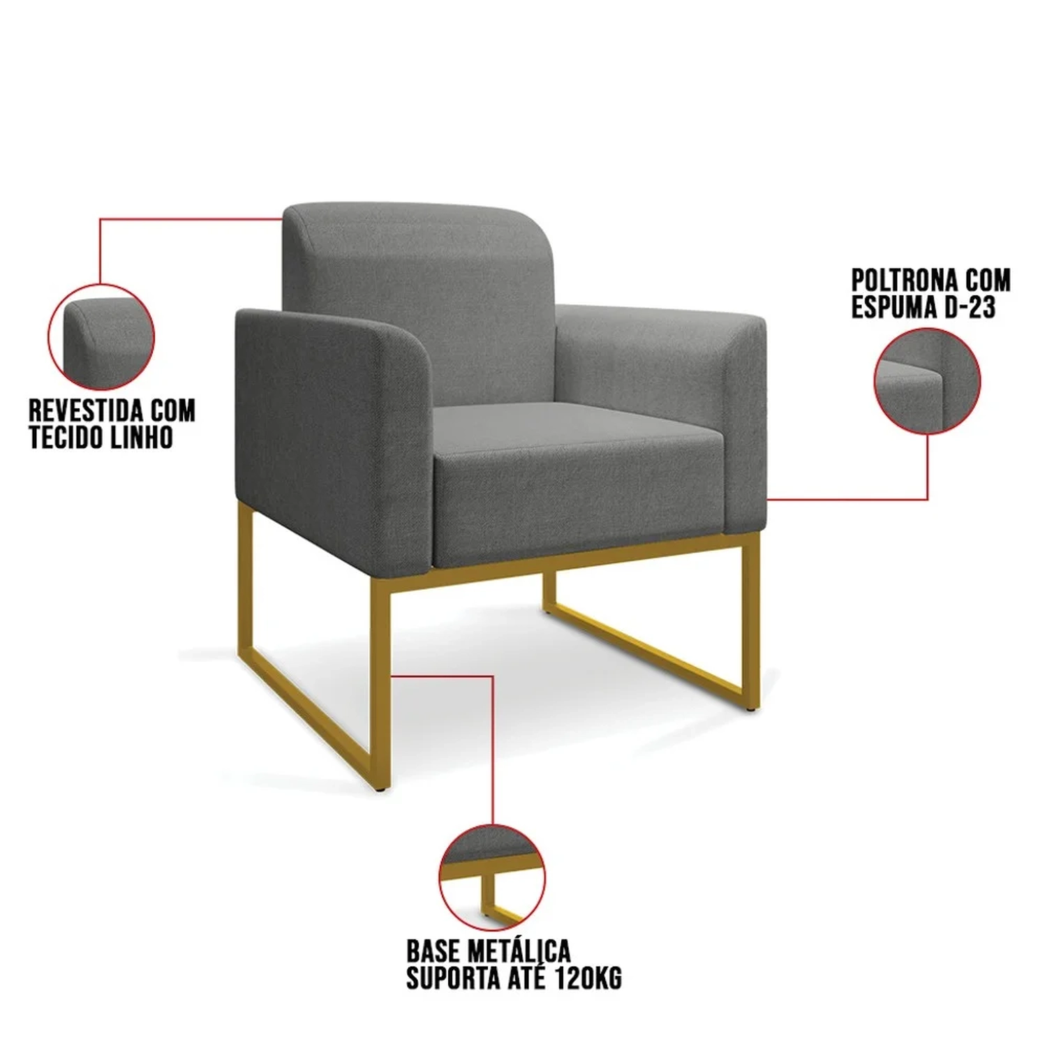 Material da Espuma: Espuma D-28 no assento e encosto e D-23 nos braços.