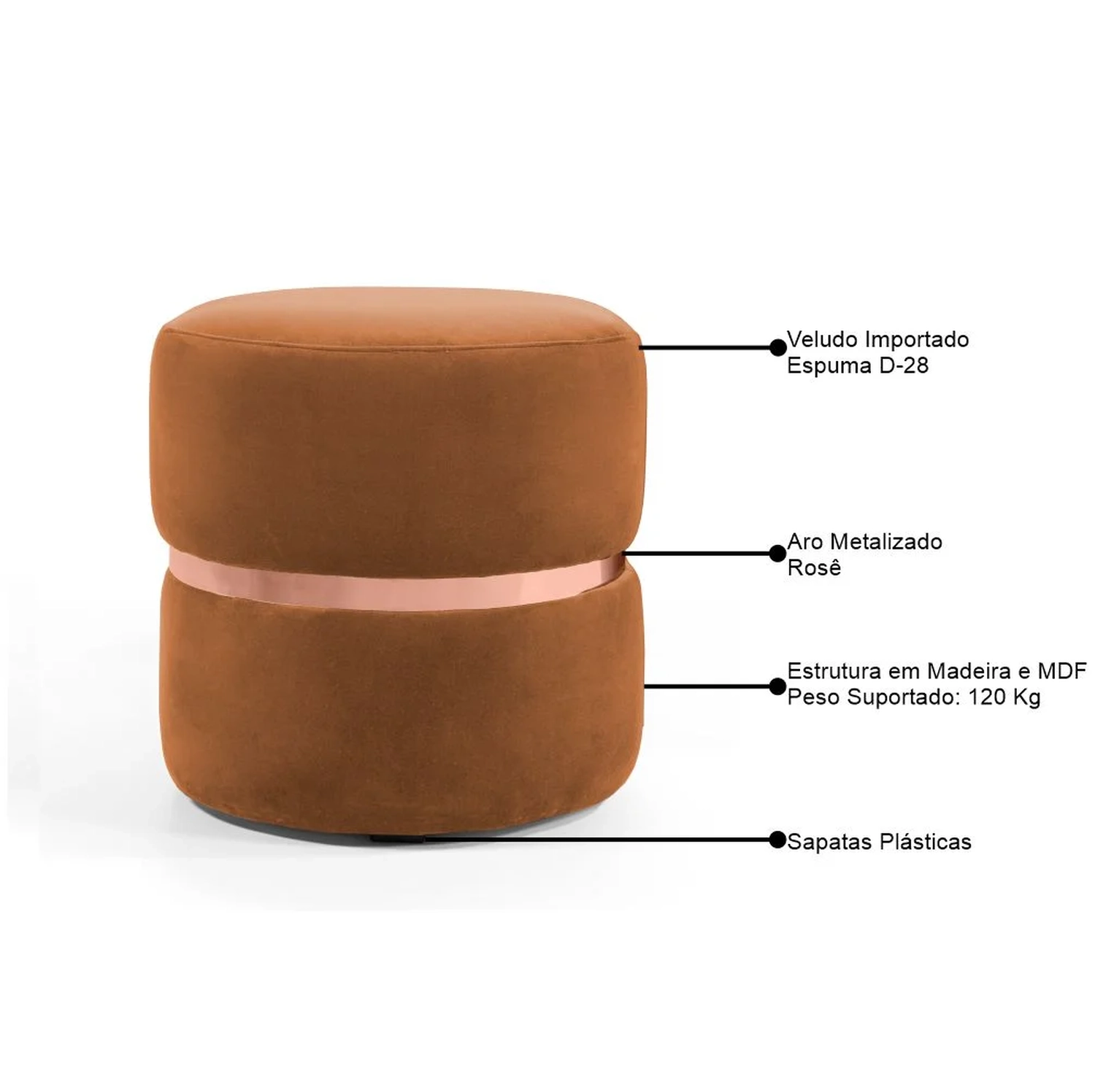Kit 2 Puffs Decorativos Com Cinto Rosê Round C-262 Veludo Laranja - Domi 660043301