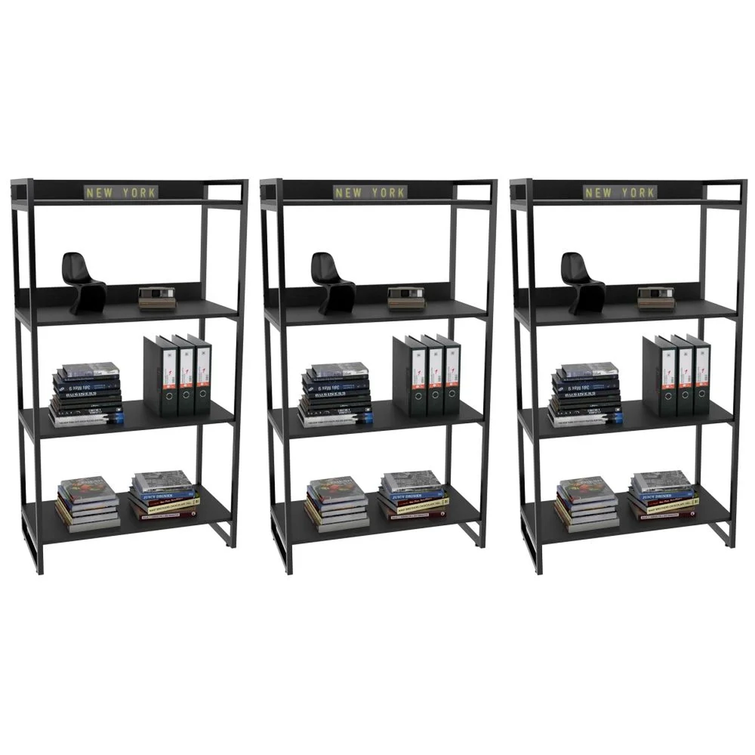 O Kit 3 Estantes Livreiro Prisma Estilo Industrial 80cm 4 Prateleiras Preto Onix - Mpozenato, é perfeito para compor sua decoração garantindo praticidade e estilo. Confeccionadas em MDP de 15 mm com acabamento em BP e partes metálicas em pintura epóxi que proporcionam maior durabilidade e resistência ao produto. Além disso, contam com design inovador com seu estilo industrial combinando os tubos de aço à madeira, trazendo um pouco do charme urbano ao seu ambiente. Ideais para expor objetos decorativos como livros. Adquira já o seu!