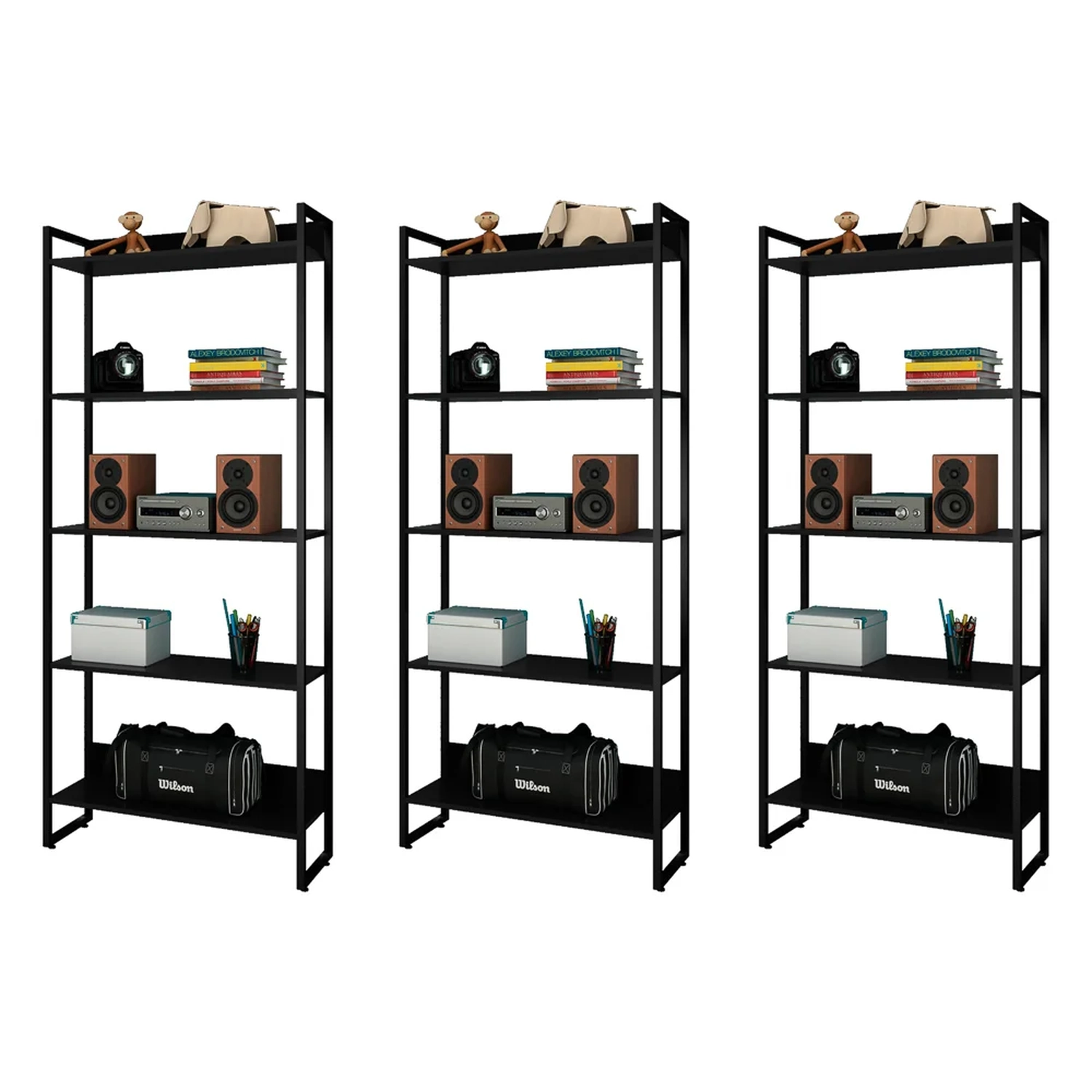 E com o Kit com 3 Estantes Studio Industrial, da Mpozenato, você vai ganhar em espaço, beleza e organização, pois essas peças possuem medidas compactas, além de uma estrutura metálica slim, confeccionada em Tubo de Aço 20x20 com pintura epóxi na cor Preto. Já as prateleiras na cor Preto são fabricadas em MDP 15mm com acabamento em BP, proporcionando maior durabilidade e resistência aos produtos.