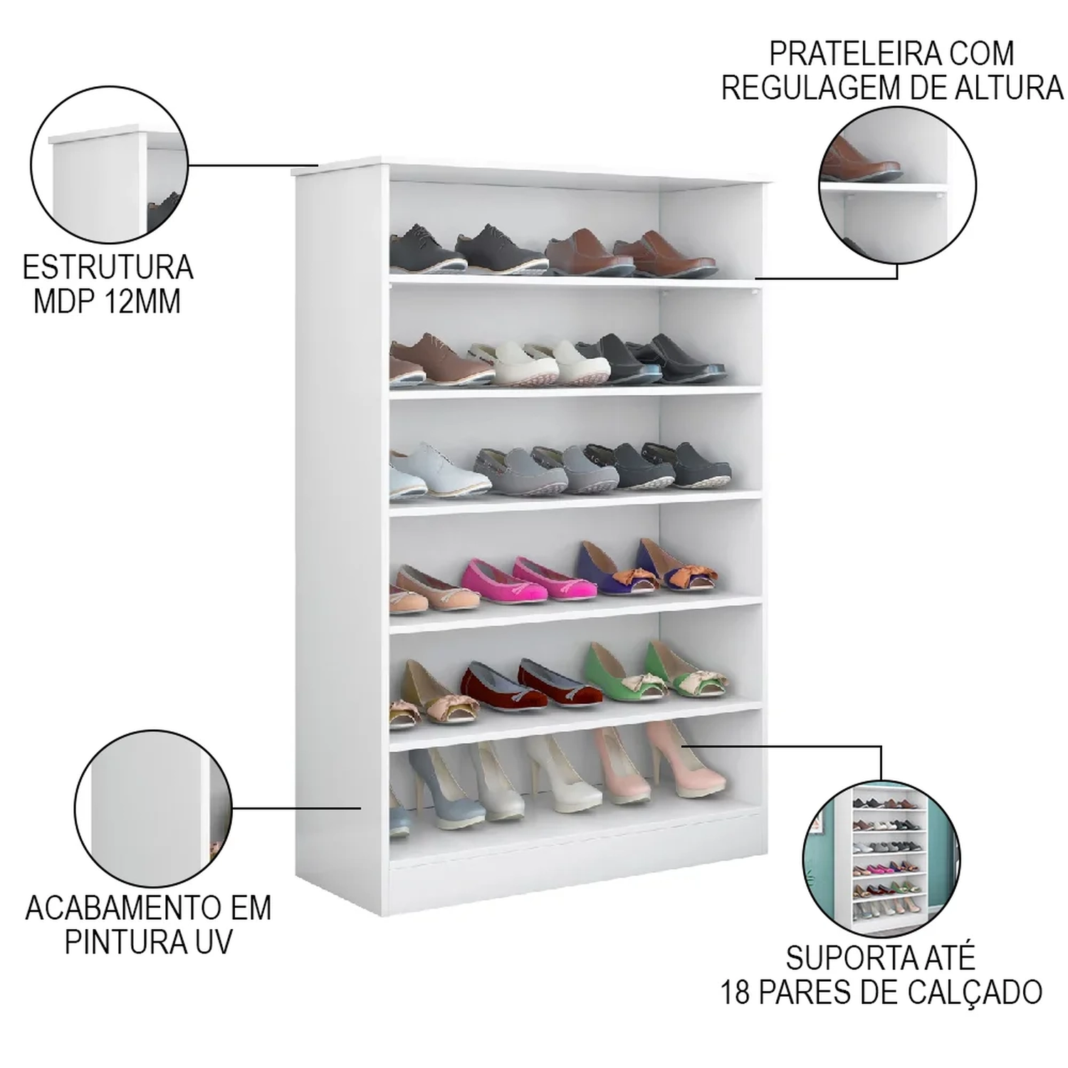 O Armário Com Prateleiras tem uma estrutura robusta e durável, feita em MDP de 12mm e com acabamento em pintura UV, ele oferece um design moderno e sofisticado. O Kit é ideal pois você pode usar os móveis juntos ou em cômodos diferentes. Além disso, ele possui cinco prateleiras internas, que permitem guardar diversos tipos de calçados e outros objetos, otimizando o espaço e facilitando a limpeza. A Sapateira Multiuso é o móvel que você precisa para deixar o seu quarto muito mais arrumado e aconchegante.