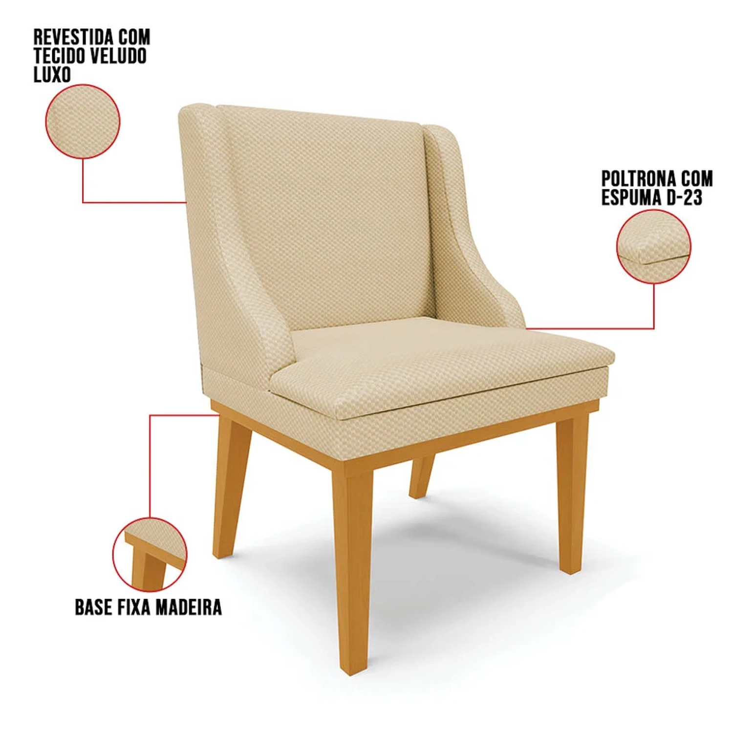 A Cadeira Lia é produzida em Madeira Eucalipto ecologicamente correta e a base fixa de madeira suporta até 120 kg, sem impacto. Seu estofamento é composto por espuma macia densidade D-23 e revestida em Veludo, tecido clássico, elegante, resistente, confortável e de toque macio.