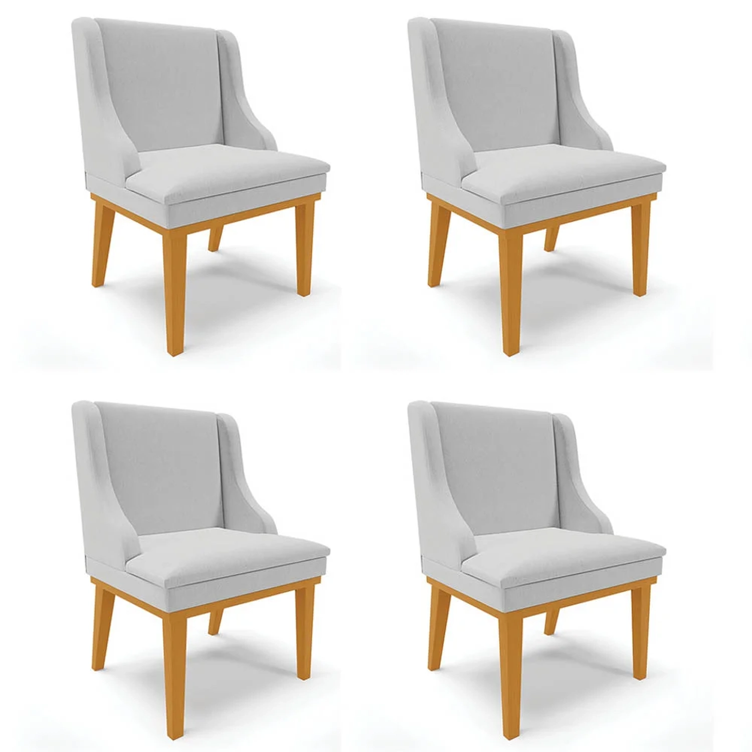 As cadeiras estofadas são essenciais para a sua casa, pois, além de agregar beleza na decoração do ambiente, são confortáveis, aconchegantes e resistentes. O Kit 4 Cadeiras Lia, foi projetado com um design exclusivo que facilita combiná-las com os outros móveis, deixando sua sala de jantar ainda mais bonita, as cadeiras são produzidas com materiais de alta qualidade, para que não se preocupe em desfrutar de bons momentos durante as refeições com sua família e amigos. Essa cadeira de jantar possui estrutura em Madeira Eucalipto de reflorestamento, ecologicamente correta e a base fixa de madeira suporta até 120 kg, sem impacto. A parte estofada é composta por espuma macia com densidade D-23 e o revestimento é em tecido Linho, que conta com propriedades térmicas, antialérgicas e toque agradável, por ser um tecido nobre transmite luxo, leveza e elegância.
