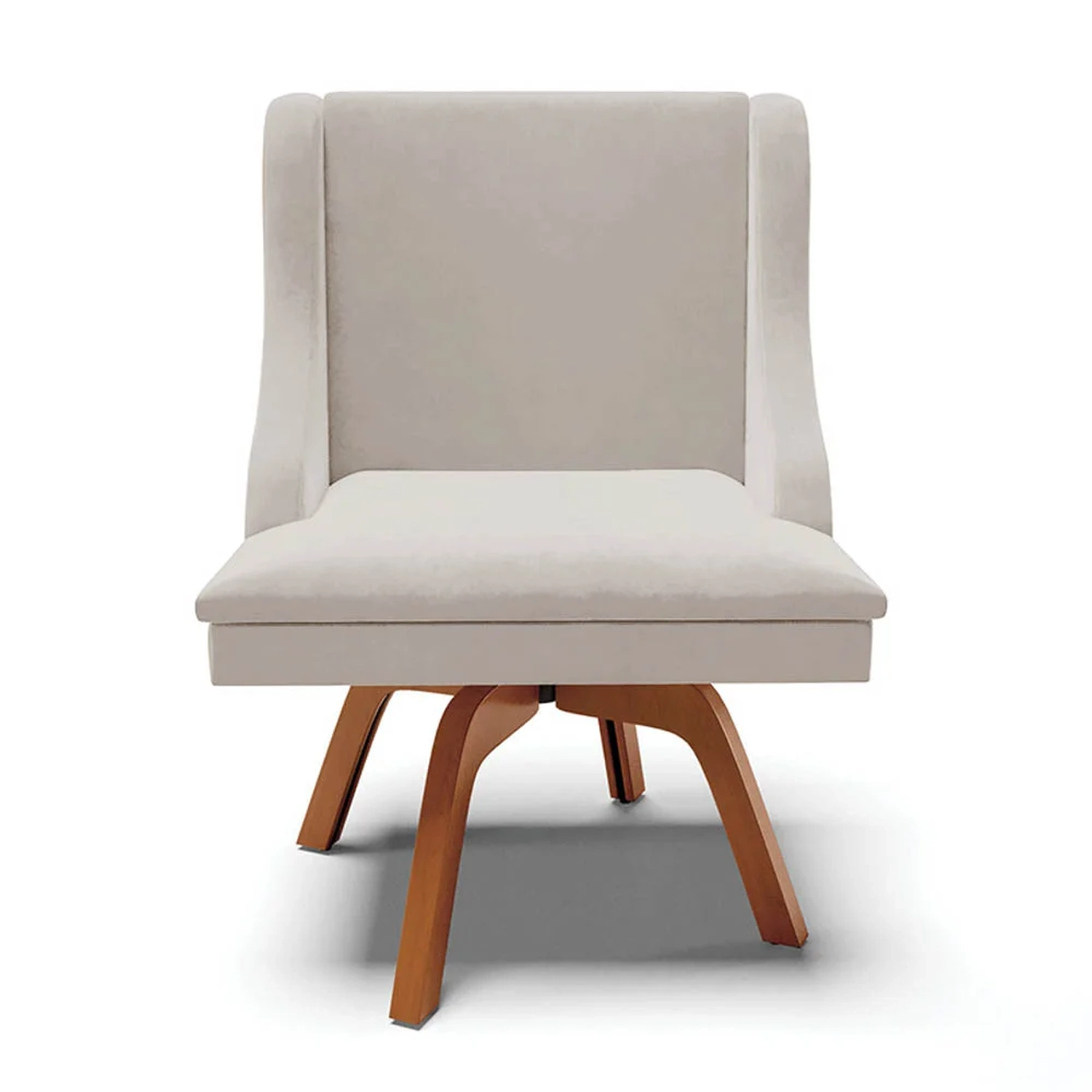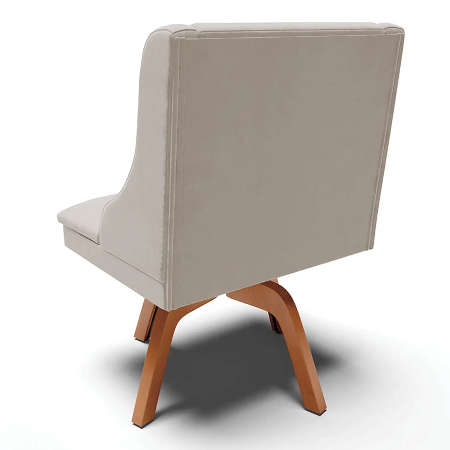 A Cadeira Estofada Lia possui design elegante e é ideal para quem busca aconchego e sofisticação na hora das refeições. A Base Giratória de Madeira é resistente e permite que se movimente com facilidade e ainda suporta até 120kg! Além disso, a Cadeira Estofada é produzida com Madeira Eucalipto de reflorestamento, ecologicamente correta e o estofado é composto em espuma macia D-23 e revestido em Veludo, tecido clássico, elegante, macio, agradável ao toque, além de resistente e durável é versátil e combina com vários estilos de decoração!