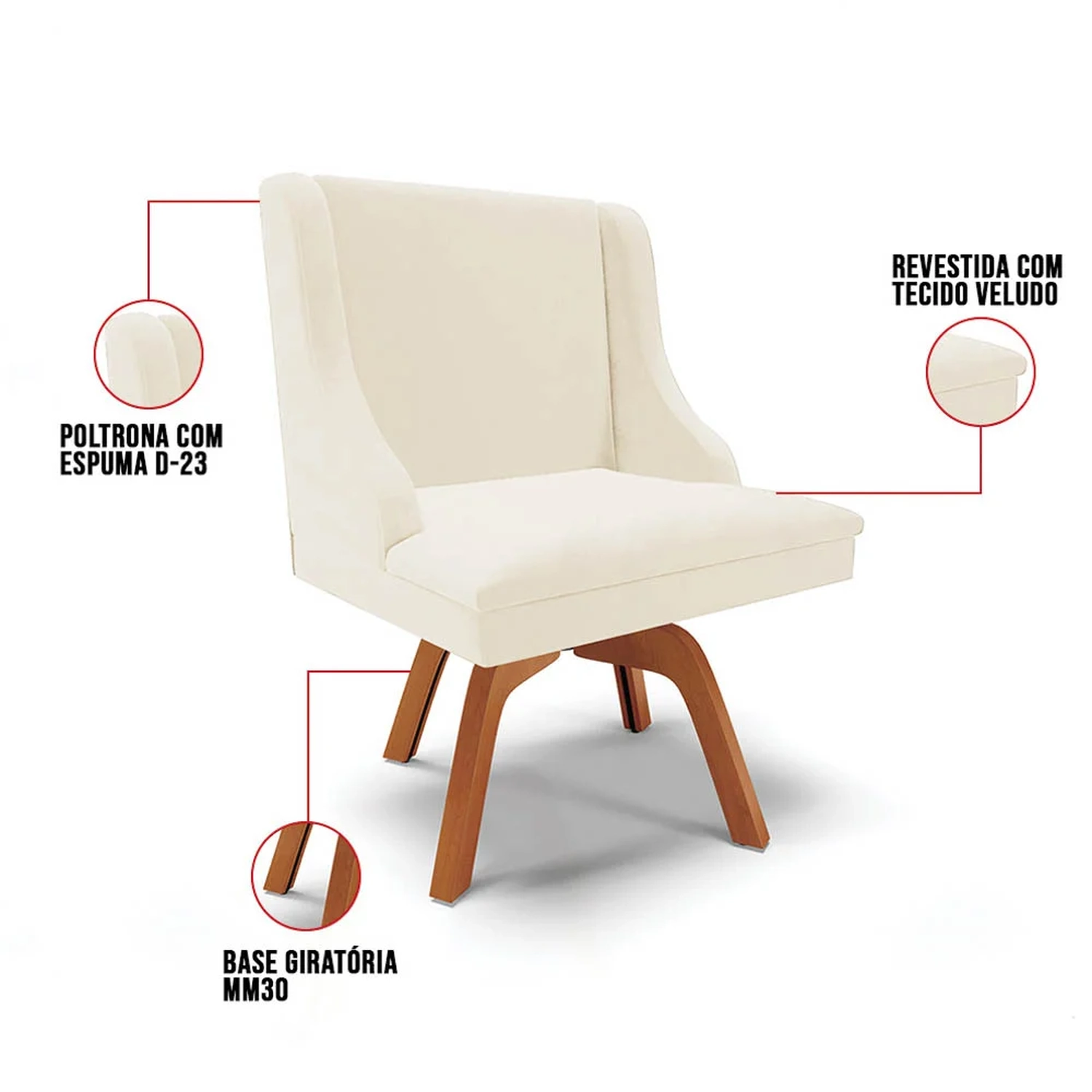 A Cadeira Estofada Lia possui design elegante e é ideal para quem busca aconchego e sofisticação na hora das refeições. A Base Giratória de Madeira é resistente e permite que se movimente com facilidade e ainda suporta até 120kg! Além disso, a Cadeira Estofada é produzida com Madeira Eucalipto de reflorestamento, ecologicamente correta e o estofado é composto em espuma macia D-23 e revestido em Veludo, tecido clássico, elegante, macio, agradável ao toque, além de resistente e durável é versátil e combina com vários estilos de decoração!
