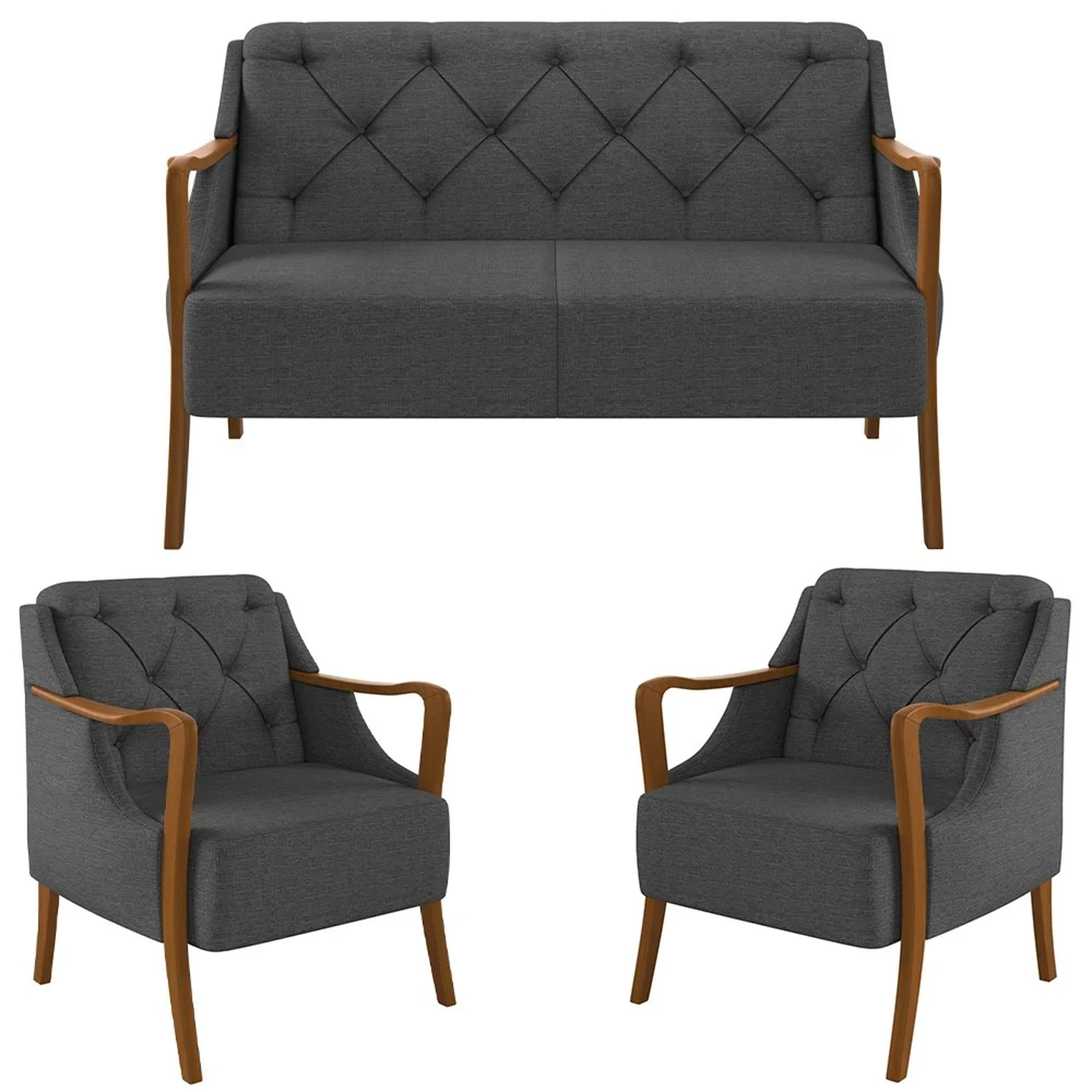 Com um design clássico e um toque de contemporaneidade, a poltrona para sala 2 lugares e as poltronas decorativas atendem todos os requisitos de quem busca bom gosto e qualidade, já que consegue combinar materiais e texturas como a madeira dos braços e o revestimento do estofado. Além disso, as bordas, braços e pés curvos juntamente com a costura capitonê completam a lista de adjetivos. Ahh, o melhor de tudo é que esse jogo de poltrona pode ser aproveitado em vários ambientes, desde a sala de estar até escritório e recepção. Demais não é mesmo?!