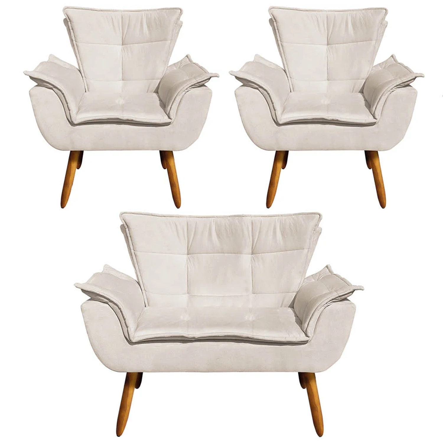 Kit Namoradeira 2 Lugares e 2 Poltronas Decorativas Pés Palito Opla Suede Bege - Ibiza 660044001