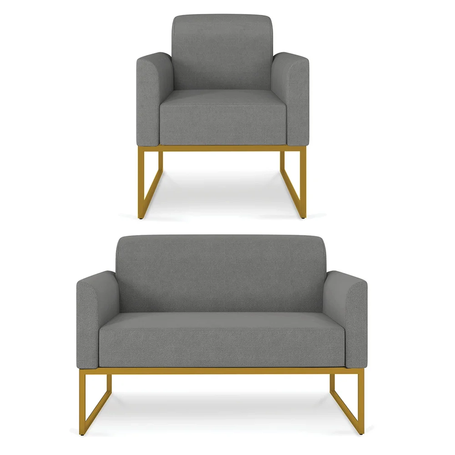 Cada escolha é uma oportunidade de imprimir o que sentimos, e para Sala de Estar desejamos conforto e beleza, para a hora de um bate-papo ou um belo café da tarde. O Kit Namoradeira e 1 Poltrona Decorativa Base Industrial Dourada Maressa A26 Linho Grafite - Ibiza pode transformar seu ambiente em algo único, sua estrutura em metal é firme e com fino acabamento, o estofado é macio e traz a leveza que o Estilo Industrial pode fazer em sua essência.
