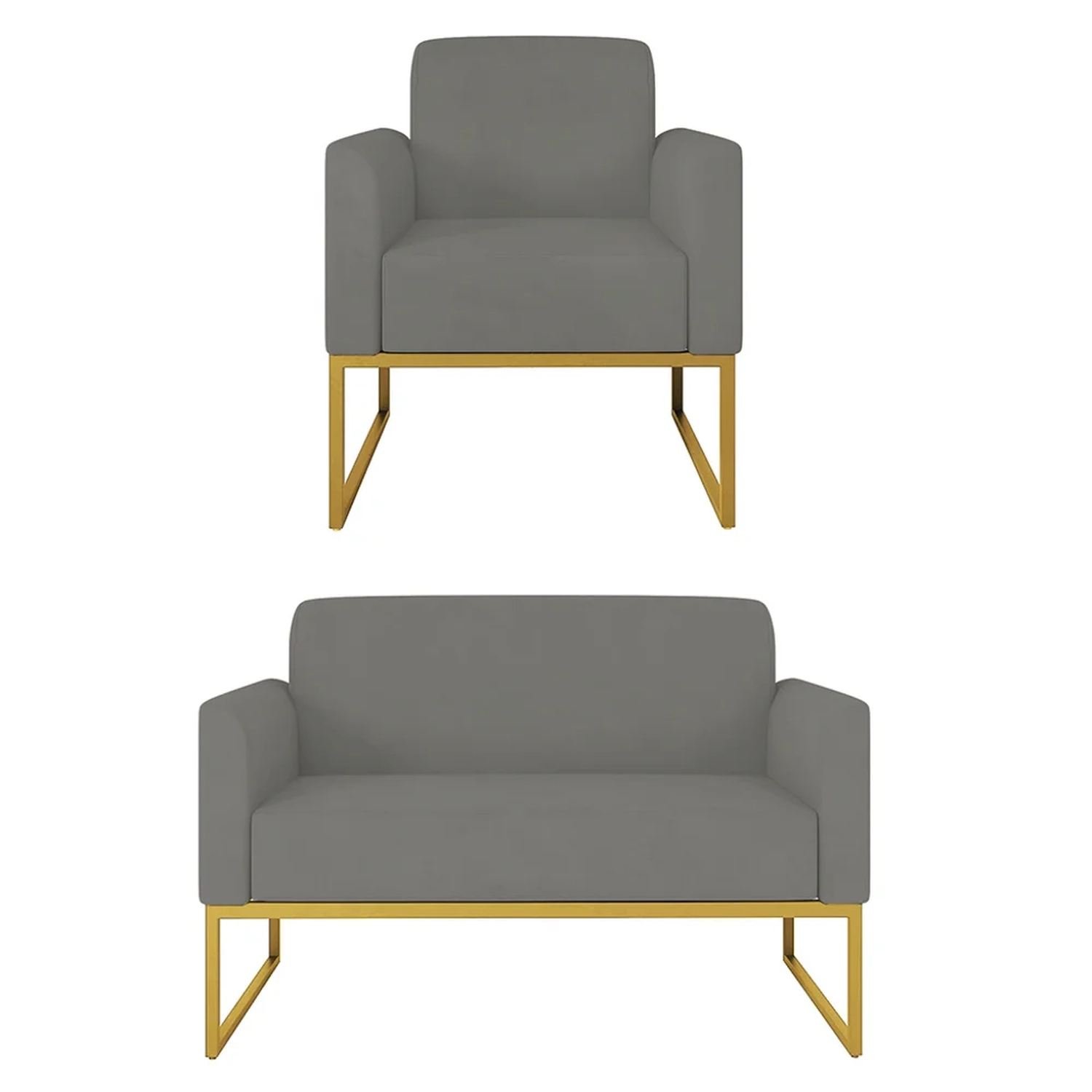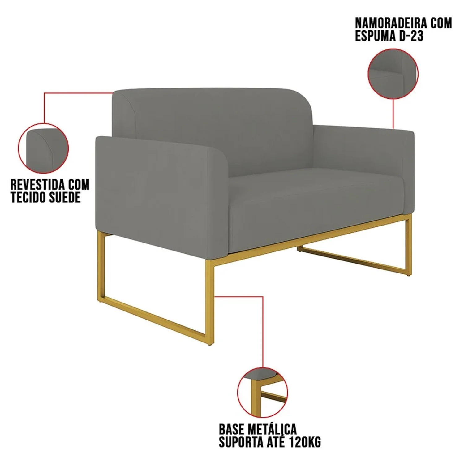 Cada escolha é uma oportunidade de imprimir o que sentimos, e para Sala de Estar desejamos conforto e beleza, para a hora de um bate-papo ou um belo café da tarde. O Kit Namoradeira e 1 Poltrona Decorativa Base Industrial Dourada Maressa S08 Suede Grafite - Ibiza pode transformar seu ambiente em algo único, sua estrutura em metal é firme e com fino acabamento, o estofado é macio e traz a leveza que o Estilo Industrial pode fazer em sua essência.