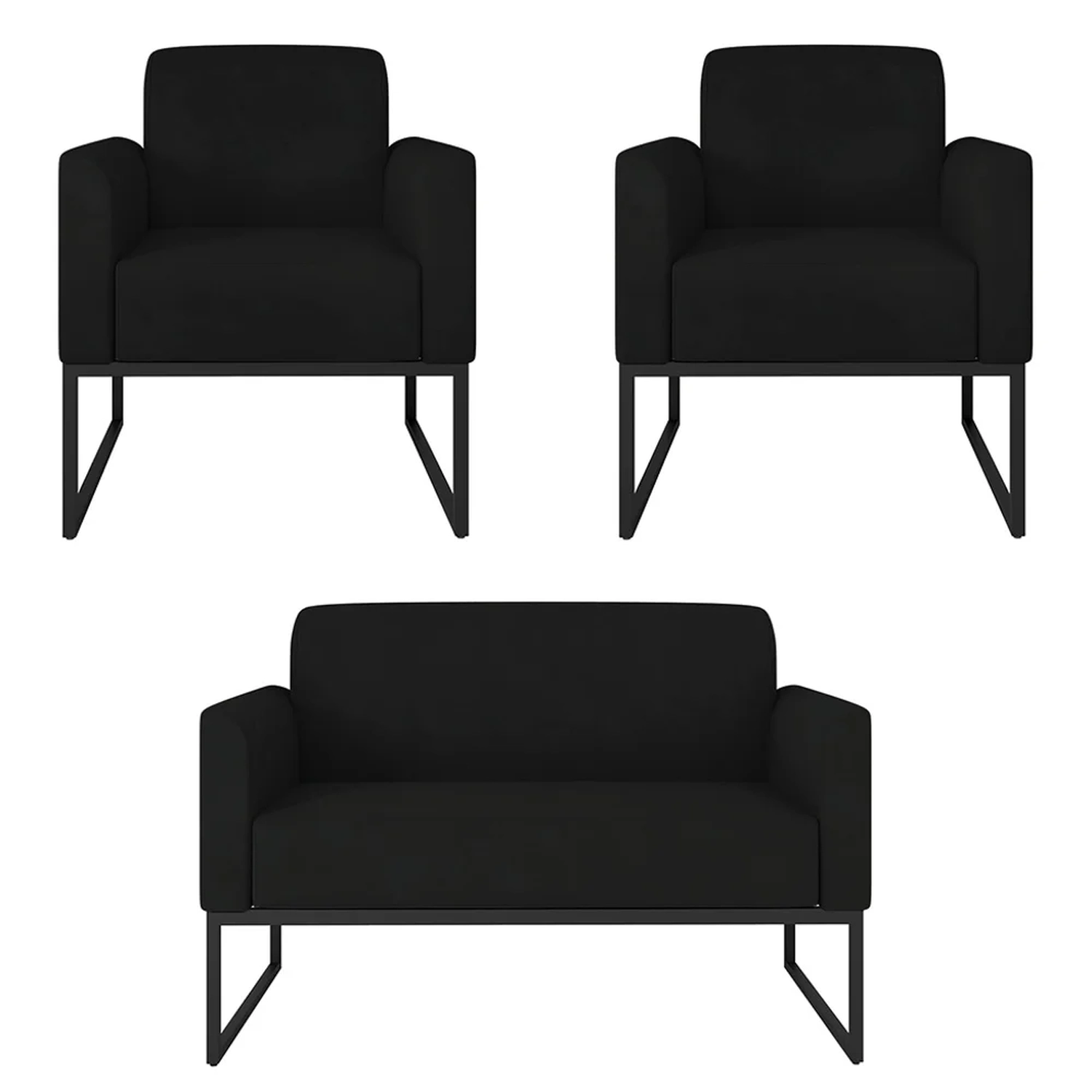 Cada escolha é uma oportunidade de imprimir o que sentimos, e para Sala de Estar desejamos conforto e beleza, para a hora de um bate-papo ou um belo café da tarde. O Kit Namoradeira e 2 Poltronas Decorativas Base Industrial Preta Maressa S07 Suede Preto - Ibiza pode transformar seu ambiente em algo único, sua estrutura em metal é firme e com fino acabamento, o estofado é macio e traz a leveza que o Estilo Industrial pode fazer em sua essência.