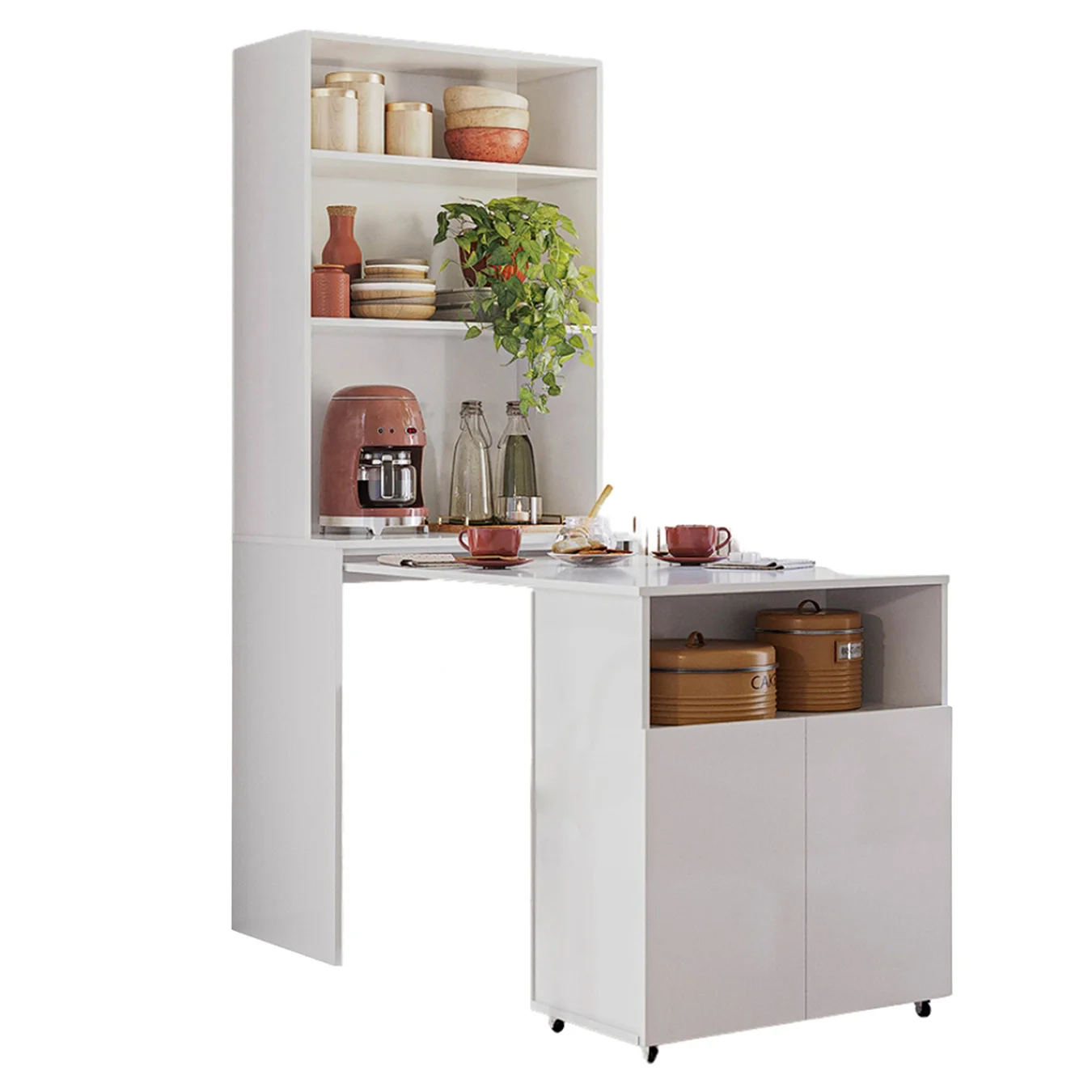 Com tampo retrátil e prateleiras, a Mesa Bancada possui uma versatilidade única, permitindo que você a utilize tanto como uma Mesa Funcional para refeições quanto como um Armário Multiuso, sem comprometer o espaço de circulação. Conta com duas portas e um nicho na parte inferior, para armazenar utensílios e mantimentos. Já na parte superior as duas prateleiras são perfeitas para exibir objetos decorativos e itens de sua preferência.