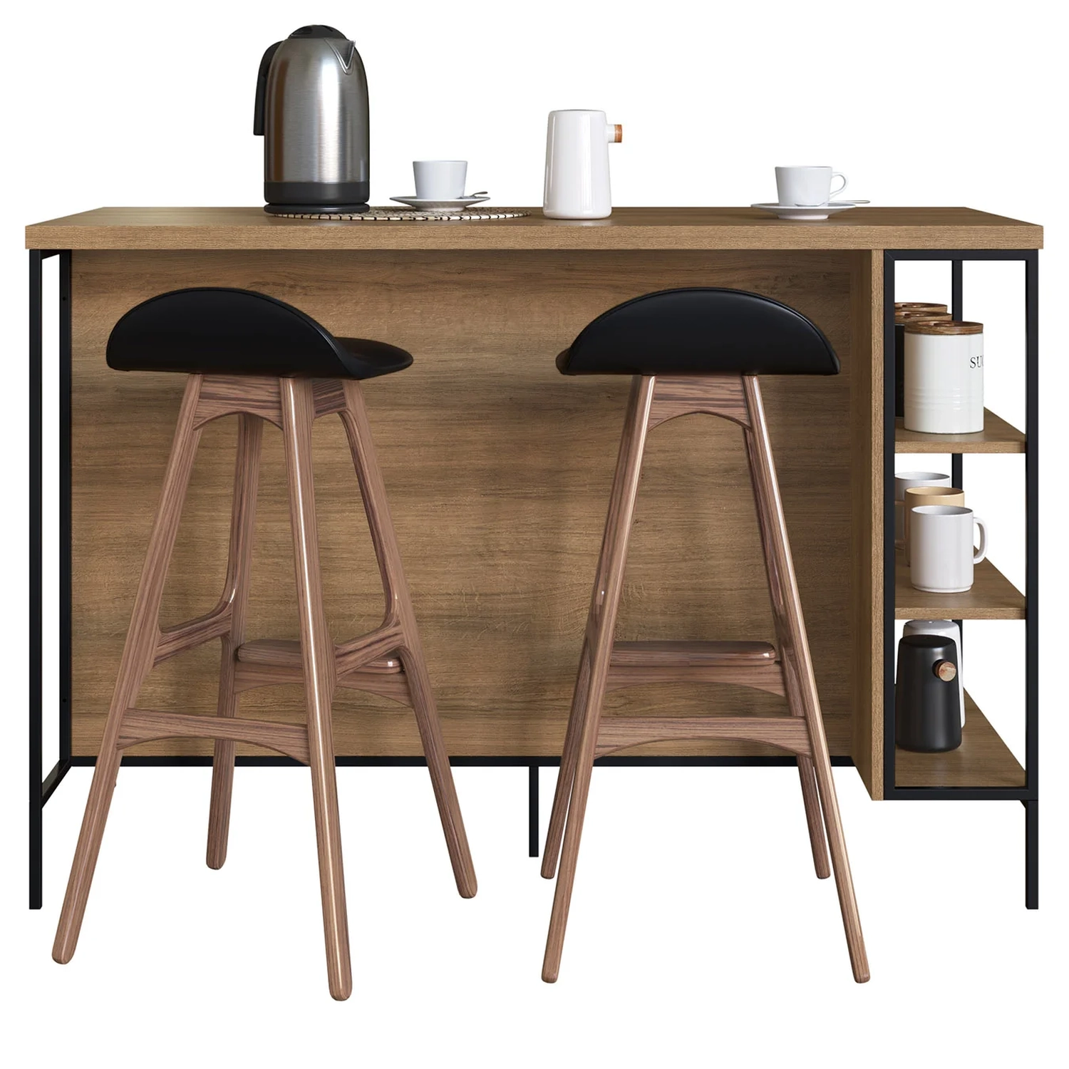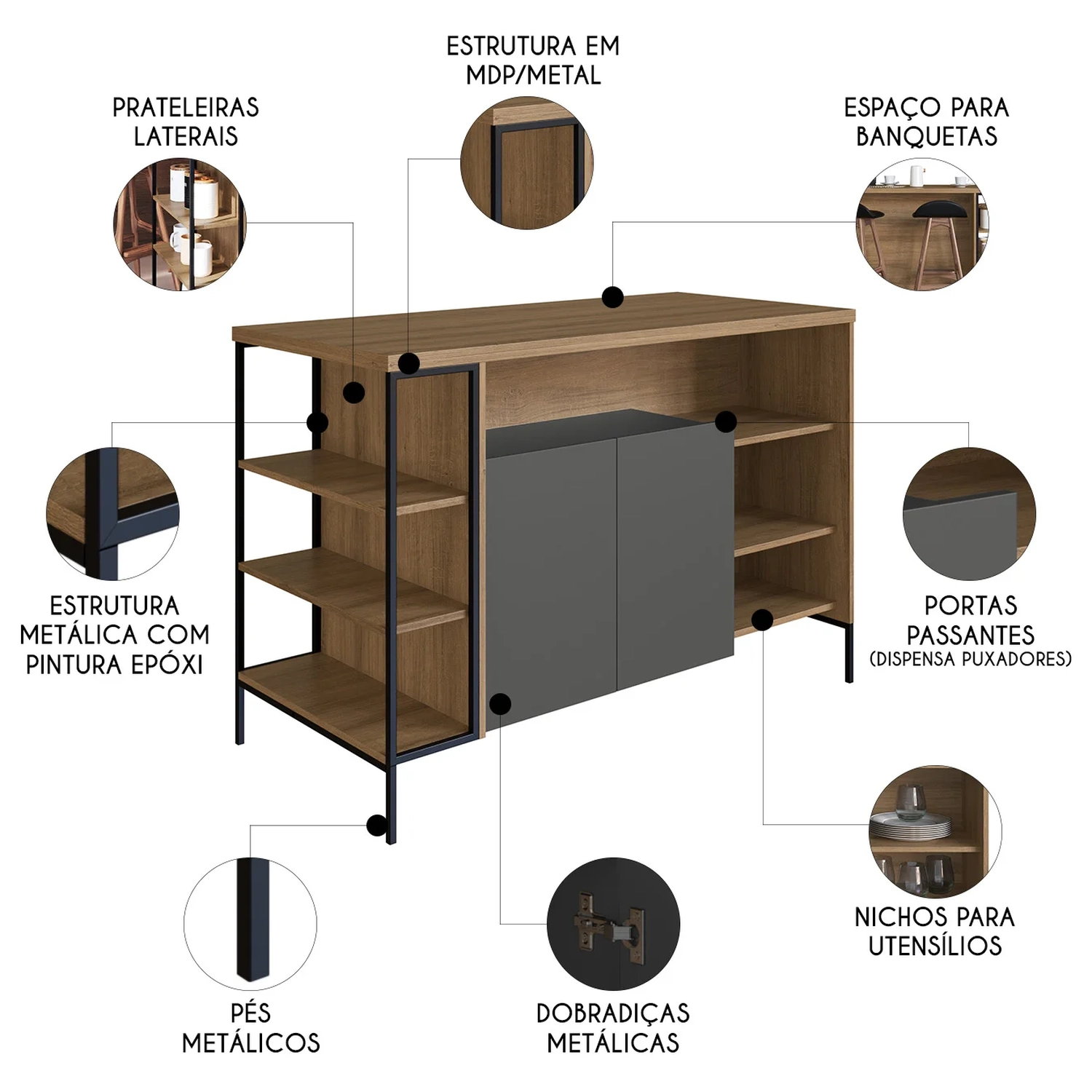 Conta com portas e prateleiras externas para organizar utensílios com facilidade, há espaço para banquetas, além disso, tem também as prateleiras laterais, ideais para condimentos e itens decorativos.
