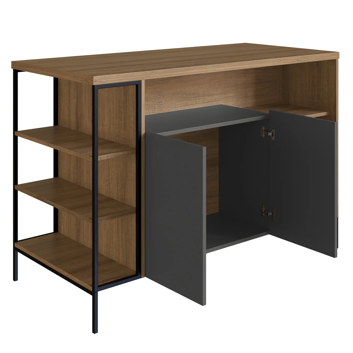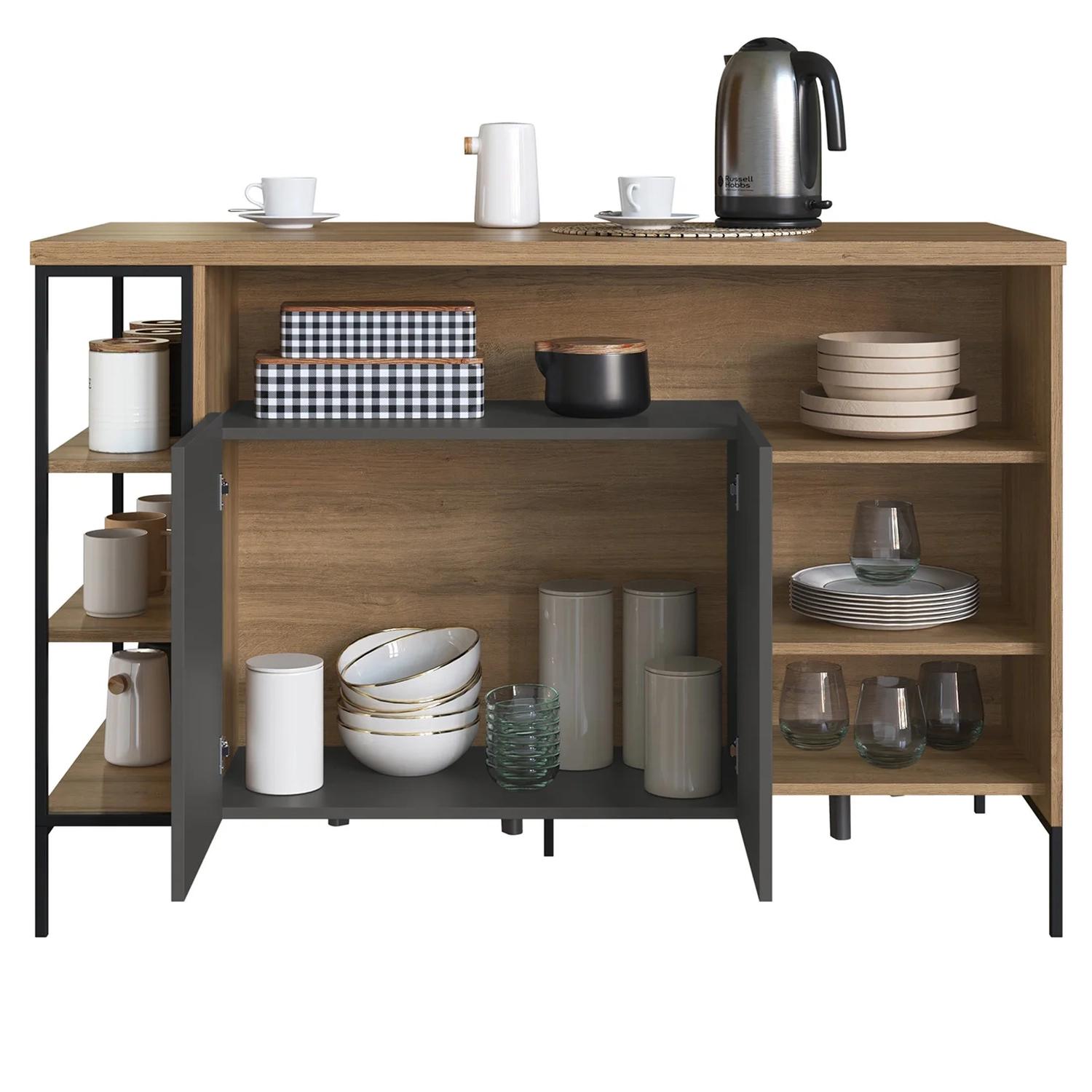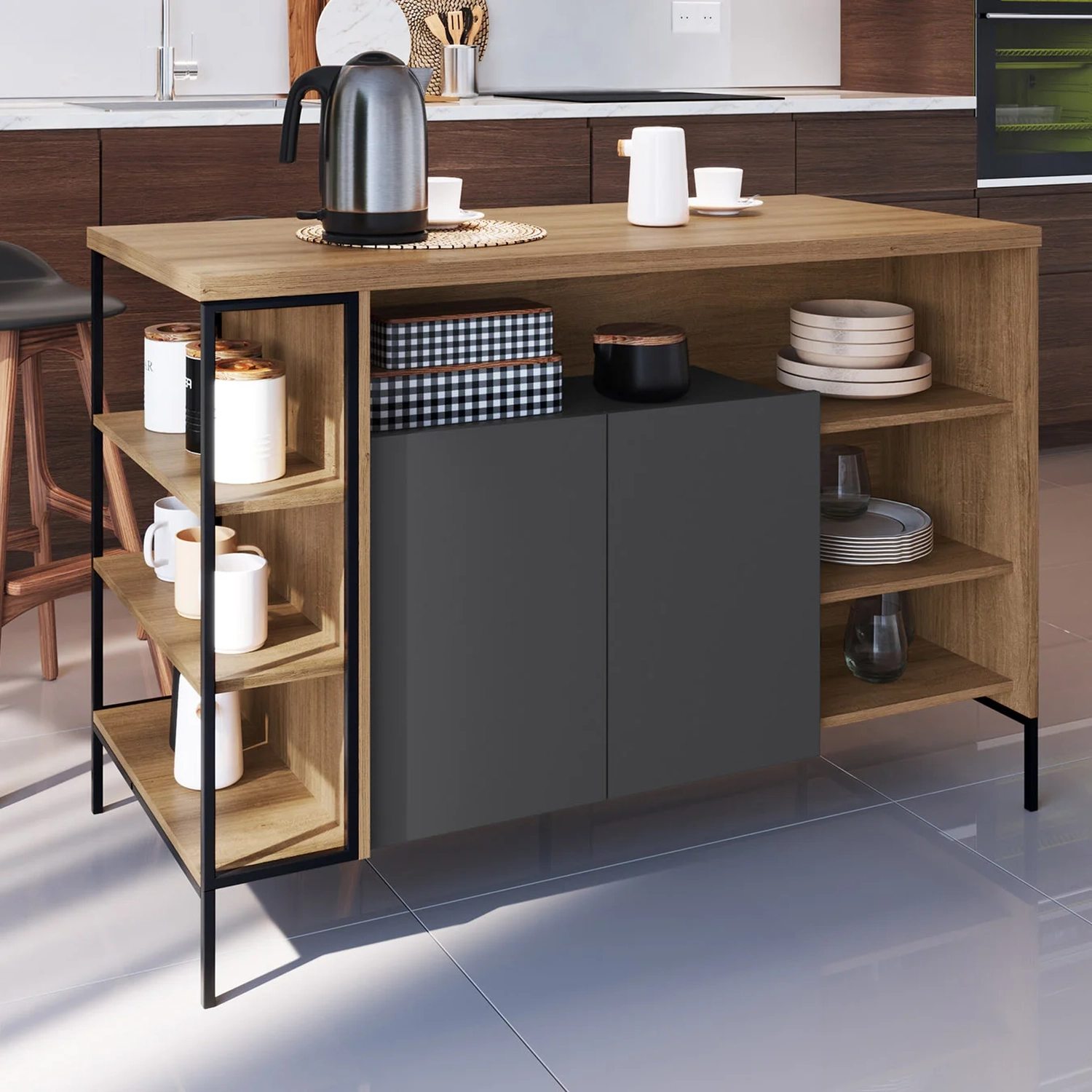 Pode ser usada como uma Ilha De Cozinha, oferecendo uma área versátil para refeições rápidas ou momentos em família. Às duas portas com dobradiças metálicas, são passantes o que dispensa puxadores.
